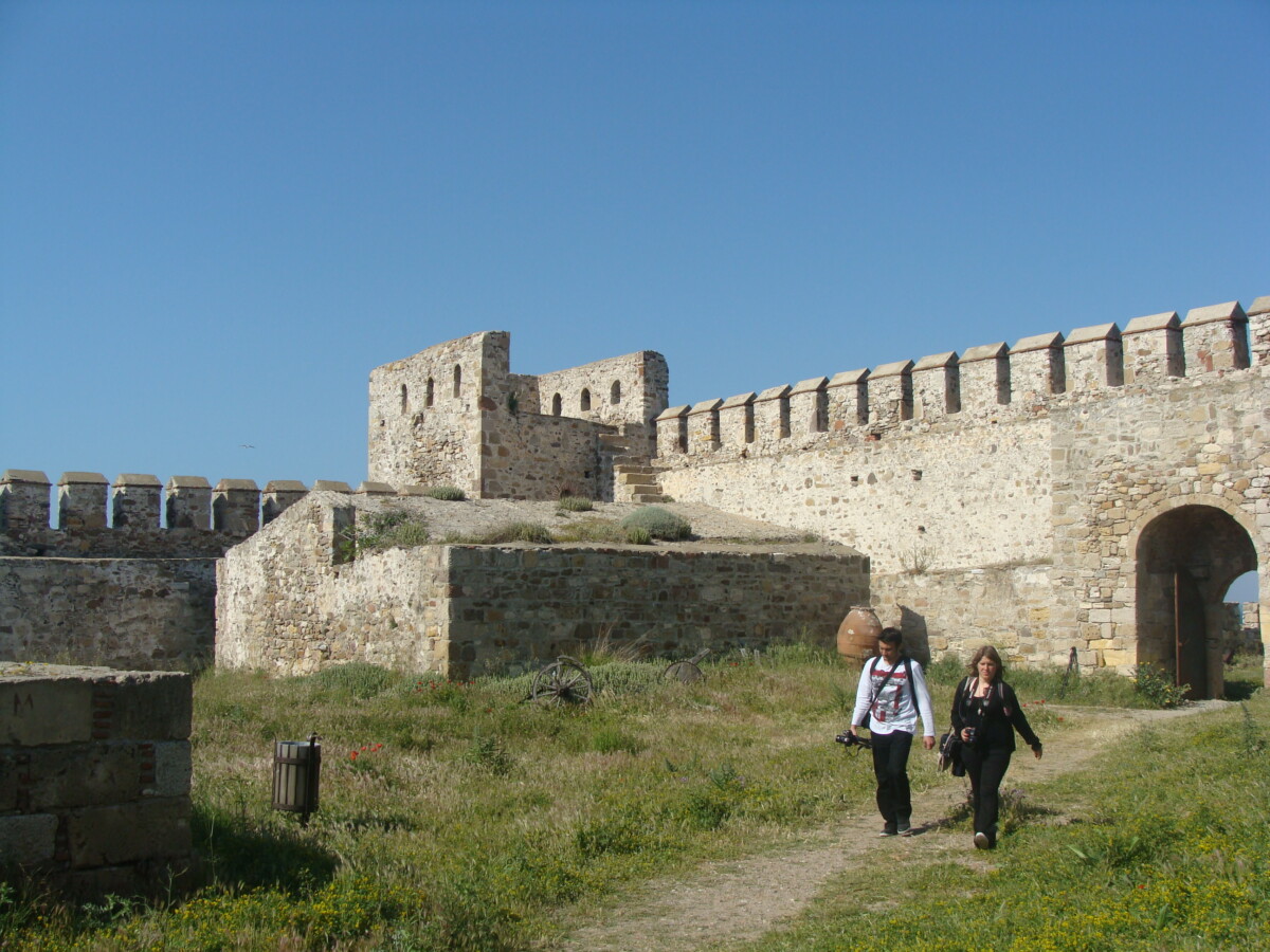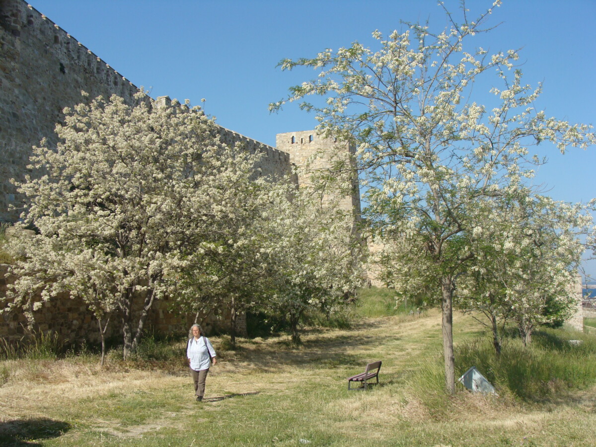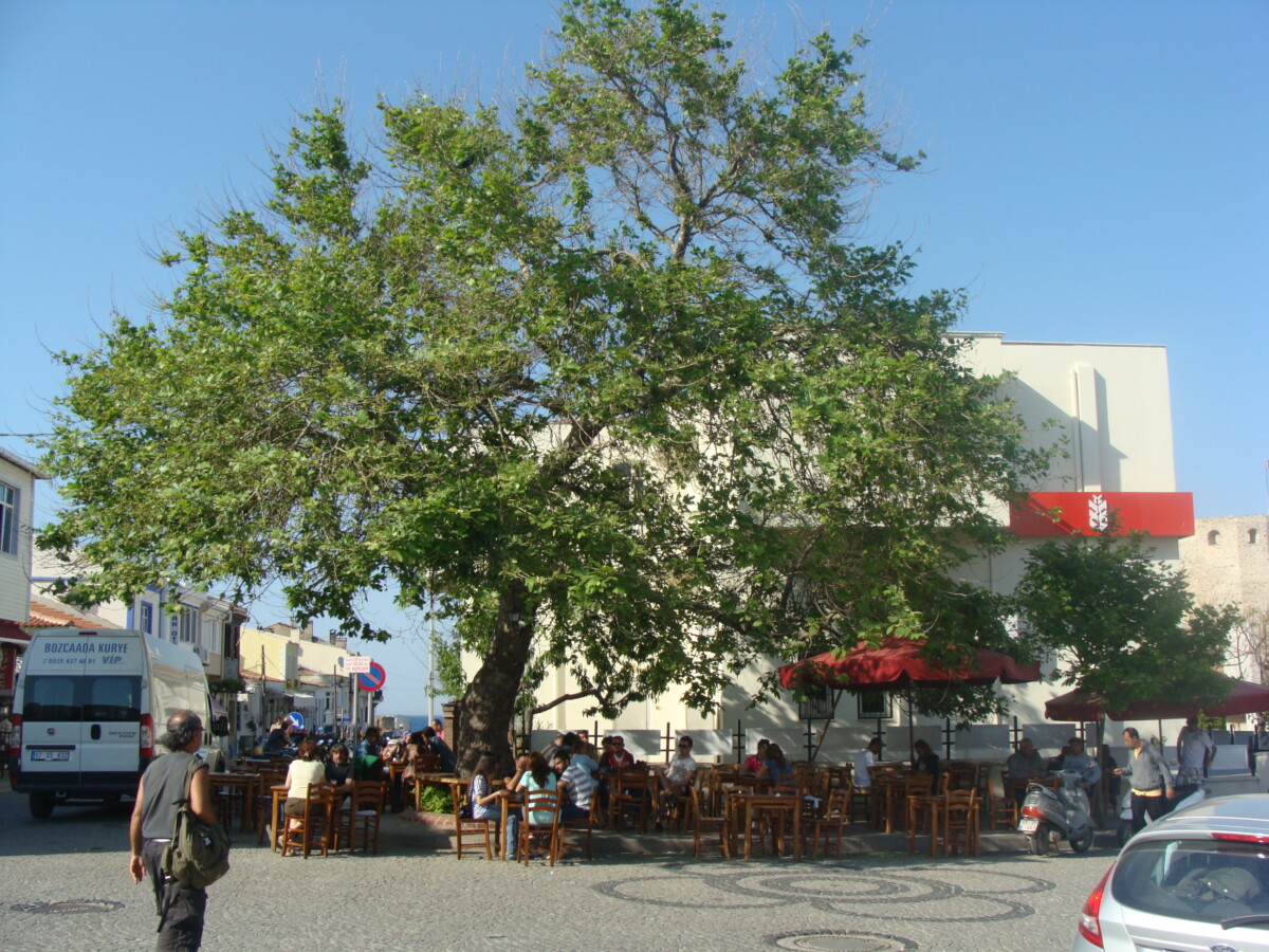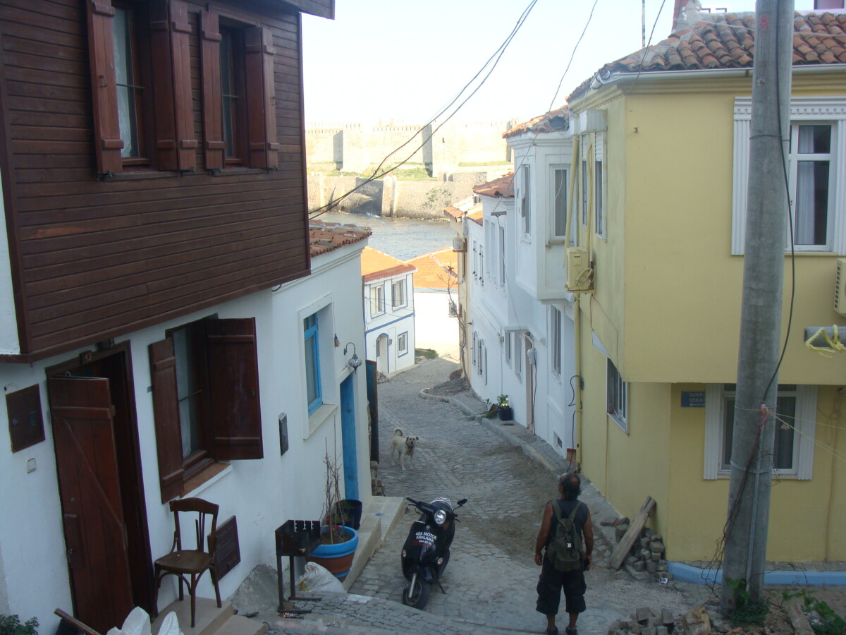 (…) 2 mei, 8.15 uur, eigenlijk vroeger dan gewenst op het terras van ons pension aan het ontbijt. Het is al warm, wel héél prettig. Grappige afscheidsconversatie met ‘Siësta’ (dat stond op z’n t-shirt en paste ook perfect bij hem), de Australische gast en zijn vrouw die 6 weken relaxed door Turkije reisden. Dan per taxi tot 6 km buiten Ayvalik, daar een overstap op een grotere bus tot Ezina en dan per oude minibus met uitsluitend autochtone bezetting tot Geyikli waar we ruim op tijd voor de boot van 14 uur naar ons doel, Bozcaada, aankwamen. De boot leek nog het meest op een oversized rivierpont inclusief flinke ruimte voor auto’s. Ook hier weinig tot geen toeristen. Een half uurtje later arriveerden we op het eiland: 10 x 5 km maximaal groot, licht heuvelachtig met een hoogste heuvel nabij het enige dorp van het eiland. Veel bagage (Karim vooral), dus gauw ons pension Nar (Granaatappel) gezocht en gelukkig ook gevonden. Zeer vriendelijke ontvangst, mooie, keurige kamers in een relatief oud huis. Gauw naar het dorpje en dan heel uitgebreid het prachtig gerenoveerde fort boven het dorp bewonderd. Opvallende flora met waanzinnige kussens van stekelige planten die zacht oogden…