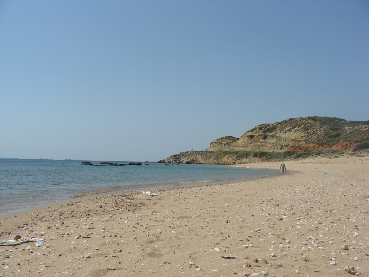 Toen wilden we natuurlijk ook graag het oosten van het eiland een beetje verkennen: die kant op leek er ’s ochtends geen bus te gaan, dus dan maar liften. Na een lange wachttijd kregen we een lift van een aardige meneer met zo’n typische oude landrover. Hij bleek de eigenaar van een klein hotelletje op het strand van Pelekas. Na elf km bochtenrijke straat boog hij af en daalde 3 – 4 km over een verschrikkelijk slingerend en gevaarlijk pad naar beneden tot op het strand. Een van de engere ritten van ons leven, maar toch ook fantastisch om te beleven. Aan het paradijselijke strand hadden hij en zijn vrouw en zoon een klein restaurantje en 8 frisse, bescheiden slaapmogelijkheden. Zee, strand, bergen, rotsen: blauw, groen, zandkleur, zwart en een wit huisje (zie foto1)… enorm fraai!!