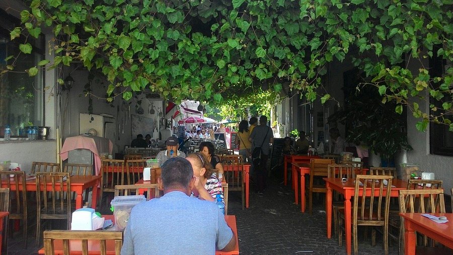 In het dorpje – rijk aan trappetjes – kris kras rond gewandeld; een markt bezocht en heerlijk gegeten op een plek die ‘home made food’ aanbood. Hier waren we nooit binnengelopen zonder Karim. Daarna nog een lekkere fles wijn van het dorp (het eiland ligt in een van de weinige regio’s met wijnbouw in Turkije) voor ’thuis’ gekocht en op een van de vele terrassen die er van boven in het dorp tot beneden aan de haven liggen, wijn van het eiland alvast voorgeproefd. Lekker! In het pension vergezelde de eigenares ons nog met een kopje Turkse koffie en vertelde over een tweede pension dat zij buiten het dorp met een grote (organic) tuin onderhoudt. Gaan we morgen per fiets naar kijken!