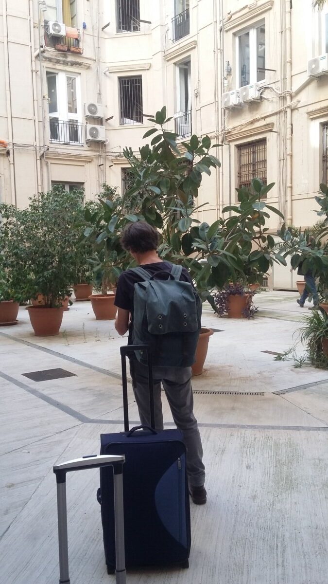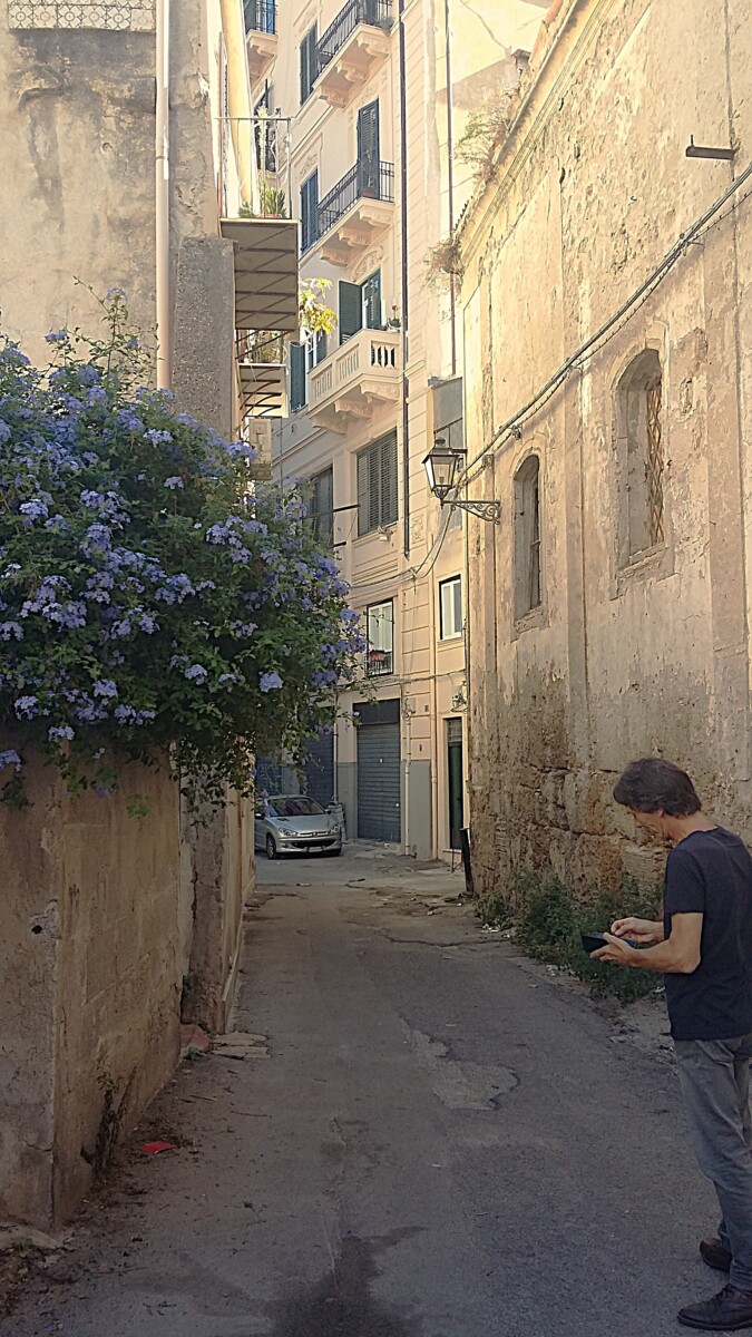 In de regel intensief groen – olijfgaarden, cactusvelden, groenten, wijn, granaatappelbomen, citroen- en sinaasappelbomen etc. – maar soms ook kaal, geploegd, geëgd voor weer een generatie groei en bloei. Wat? Hooilanden, graan…??? Daarvoor moeten we in de lente terugkomen. De laatste, ons nog onbekende 40 kilometers waren aangenaam groen en heuvelig voor het oog: weinig hoogbouw en industrie. Tegen de middag arriveerden we al in Palermo. Mooi, een oud, druk station en ook de directe omgeving indrukwekkend grootstedelijk, spannend. Ons adres voor de komende dagen vonden we gauw: een carré van ‘goedburgerlijke bouw’ van 1890-1910 schatten we. Gerenoveerd, 6 verdiepingen hoog + souterrain, metalen liftschachten uit de tijd van Schindler. Een superdrukke Italiaan legde ons in sneltreintempo alles uit over het 8ste verblijfsadres van onze reis. Viel mee wat we passief allemaal al begrepen! Mooi: we hadden het rijk minstens op de eerste dag voor ons alleen: een grote woonkamer/keuken van ca. 40 m2, een flinke slaapkamer en badkamer (alleen voor ons gebruik).