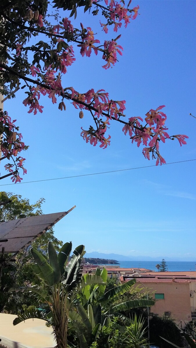Nooit meegemaakt: een hele lange ICE in twee delen over de Middellandse Zee ‘op z’n smalst’, vergelijkbaar met het Marsdiep bij ons. Tegen 16 uur rolde de trein via Messina tot Taormina Giardini, ruim een half uur treinreis langs de Oost-Siciliaanse kust. Langs mooie, hoge bergen, druk bewoonde kust en azuurblauwe zee. De op zich korte wandeling van het station tot ons B&B adres was weer even een crime: weer bijna geen stoep, langs een drukke straat lopen (met bochten en hoogteverschillen). We hebben het overleefd en werden beloond met een leuk adres, twee balkons, een met zeezicht en -geluid!