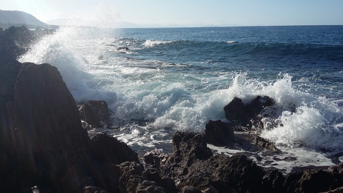 20 oktober: Zonnig warm was het al toen Willy bij de nabije bakker vers brood kon kopen. Op ons heerlijk dakterras genoten we al de zomerse sfeer, het uitzicht en een mooi zondags ontbijt. Voor onze eerste koffie gingen we naar het busstationnetje met een mooi terras op de eerste verdieping en uitstekend zicht op de bedrijvige haven. Om 10.15 uur vertrok daar een grote bus met twee grote groepen bejaarde dames cq. jonge studenten die op driekwart van de busrit allen uitstapten voor een bekende Puimsteenkustwandeling. Ruimte!! Met een handvol Fransen en inheemsen stapten wij bij de eindhalte in Aquacalda (Warmwater) uit: een fraai gelegen kustdorp, Middellandse Zee, kiezelstranden, rotsen en hoge bergen als achtergrond.