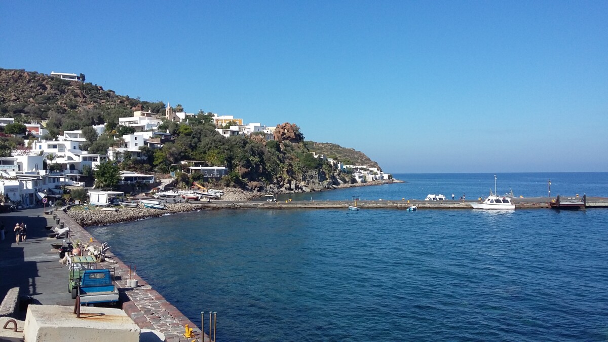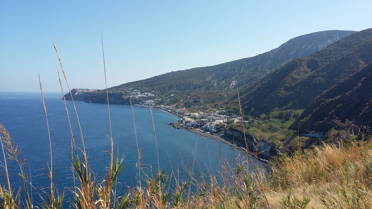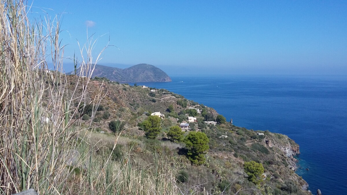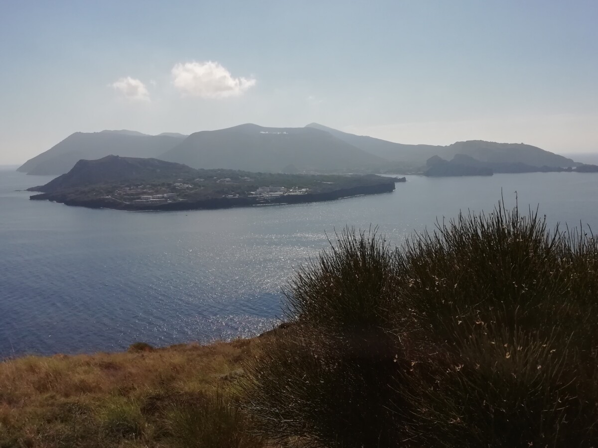 Heerlijk stil was het hier: zachte golven, zachte wind, enkele vogels, af en toe een auto, een stem. Warm, zo niet heet (in de zon) was het wel. Toch maar bergop naar een uitzichtpunt vanwaar je de buureilanden Salina (NW), Panarea (NO) en Stromboli mooi kon zien liggen. Toen we na twee kilometer het mooiste punt bereikt hadden, gingen we via de kleine, nauwe straat naar Quattropani (Vierbroden) terug naar ‘Warmwater’. Mooi, stil, weids was alles.