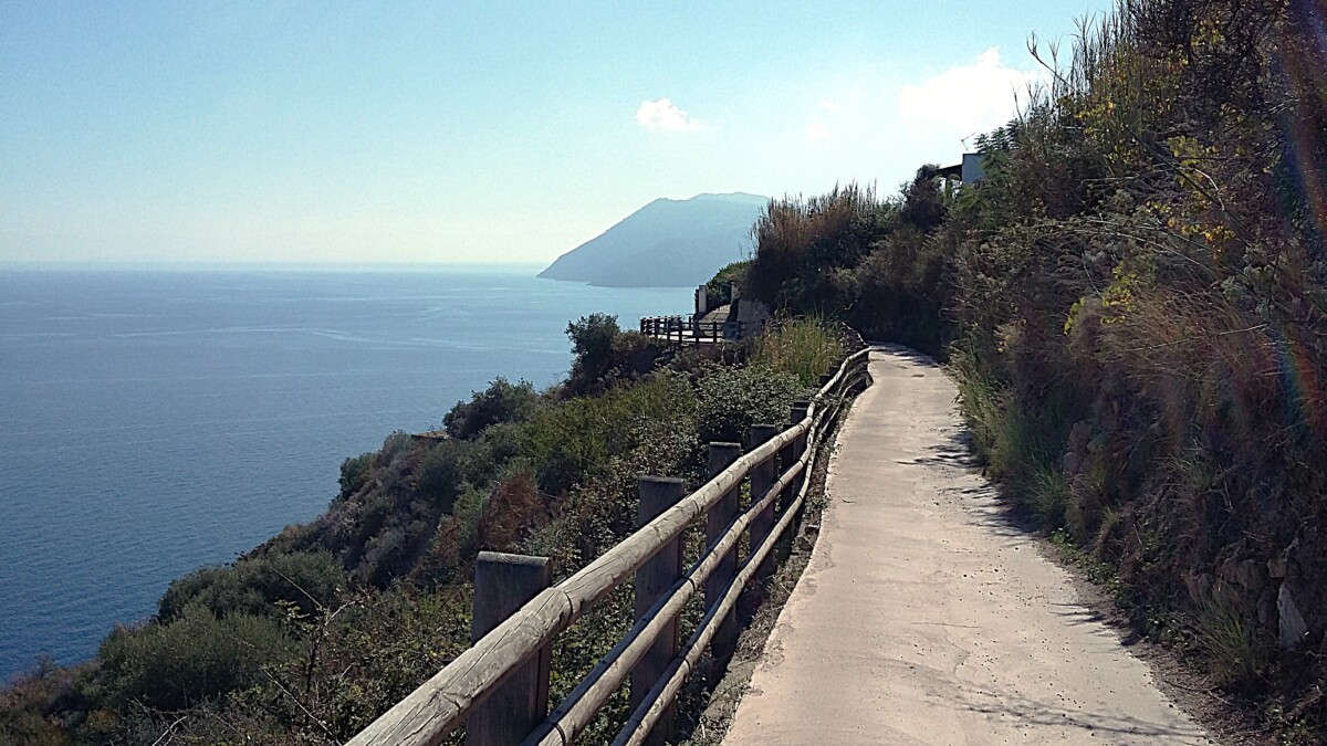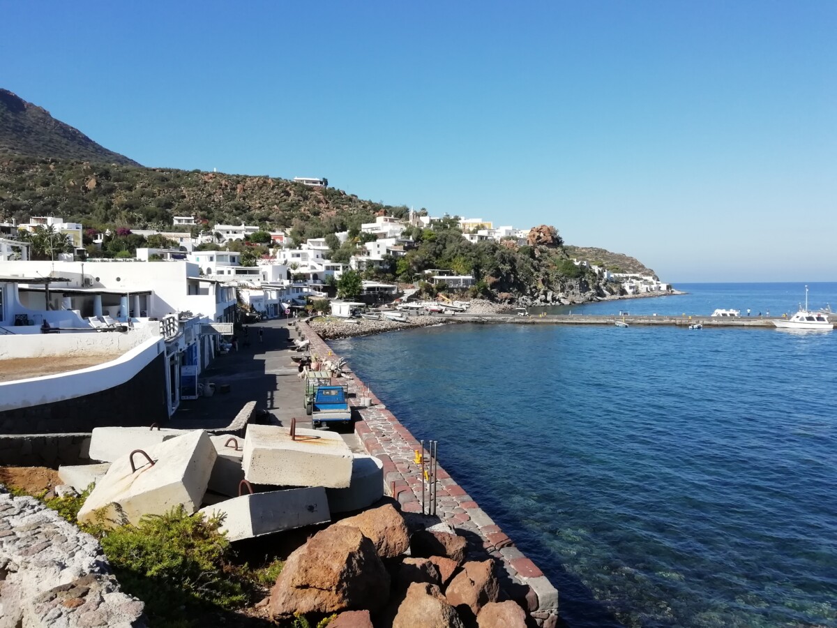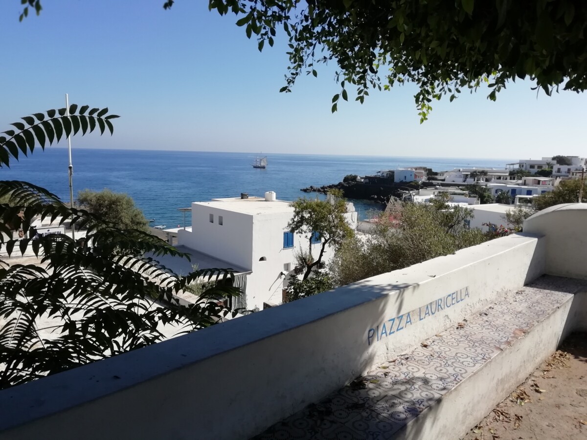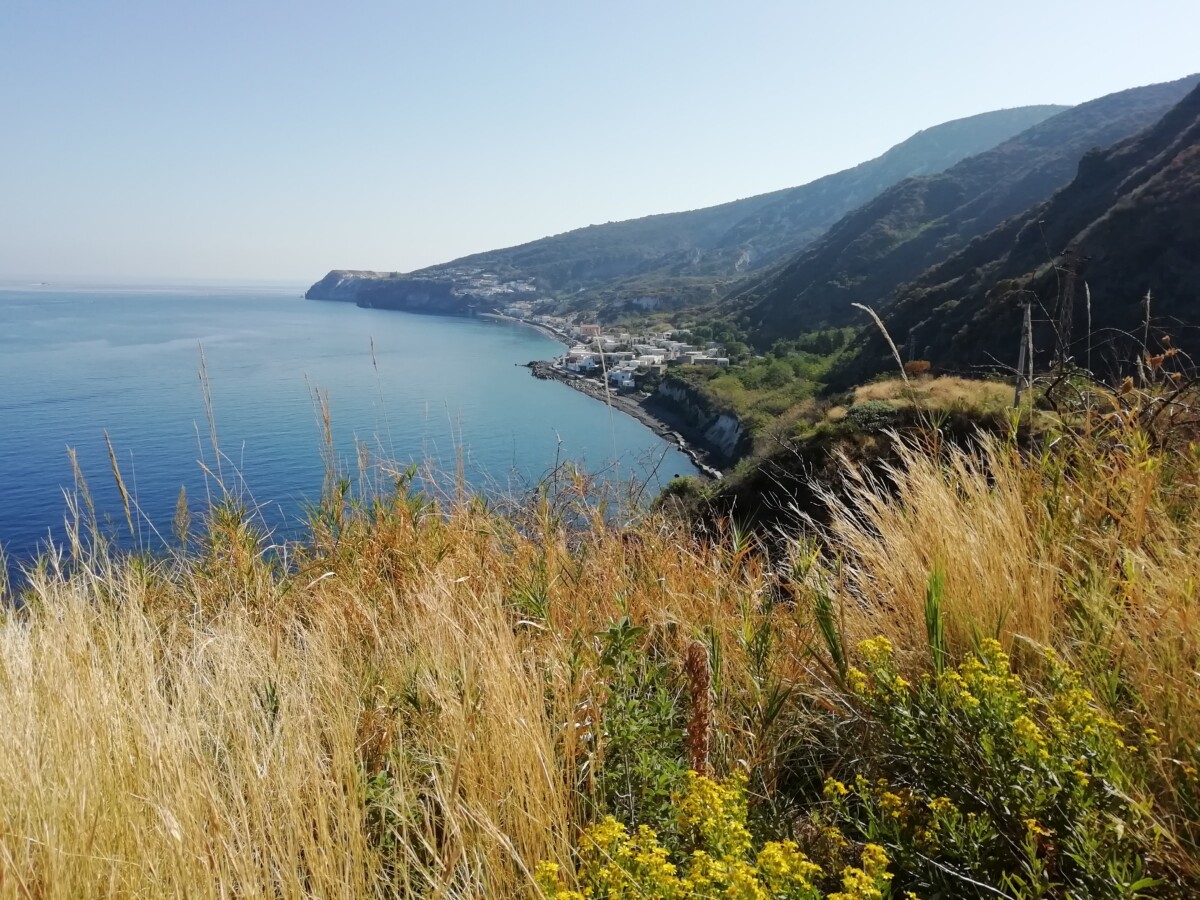 Heerlijk stil was het hier: zachte golven, zachte wind, enkele vogels, af en toe een auto, een stem. Warm, zo niet heet (in de zon) was het wel. Toch maar bergop naar een uitzichtpunt vanwaar je de buureilanden Salina (NW), Panarea (NO) en Stromboli mooi kon zien liggen. Toen we na twee kilometer het mooiste punt bereikt hadden, gingen we via de kleine, nauwe straat naar Quattropani (Vierbroden) terug naar ‘Warmwater’. Mooi, stil, weids was alles.