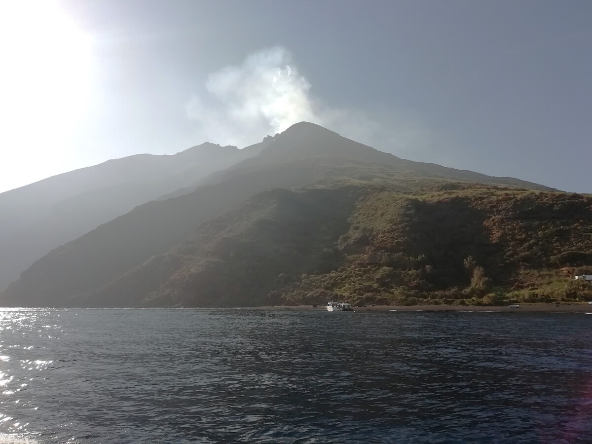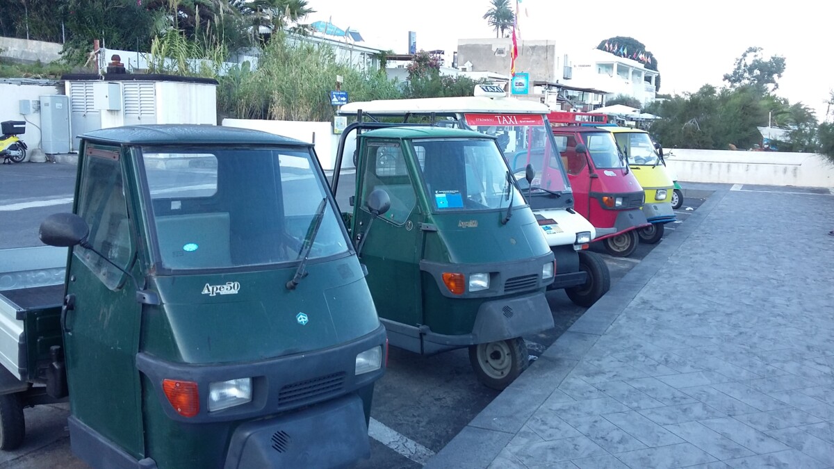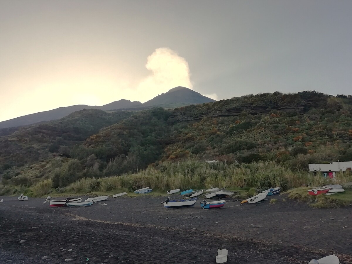 voor Stromboli, het hoofddoel van de reis. Ook hier was weer een zwempauze ingelast. Op Stromboli arriveerden we om 15.30 uur en we mochten er tot 17.45 uur van onze individuele vrijheid genieten. Erg bijzondere plek: ruige opzet, geen knusse ‘kashba’, eerder losse huisjes, lange stegen, veel groen ertussen, veel ‘aparte vogels’, zowel wat de inwoners betreft als ook de gasten! En nooit zoveel elektrische driewielers (Piaggio’s) gezien: het wemelde er in de straatjes van. Maar verder heerste er in oktober vooral een ander levensritme, rust, zwarte stranden, constante stoom boven de top van de vulkaan op 900 m!