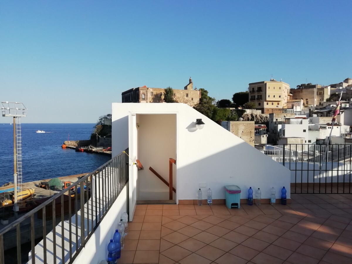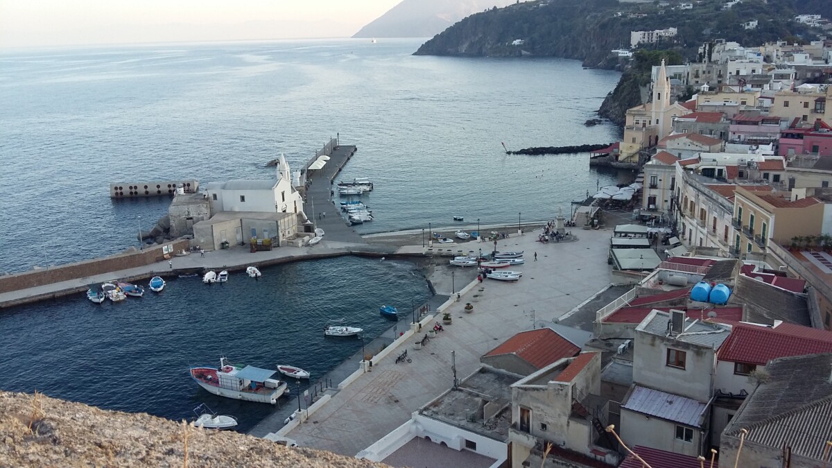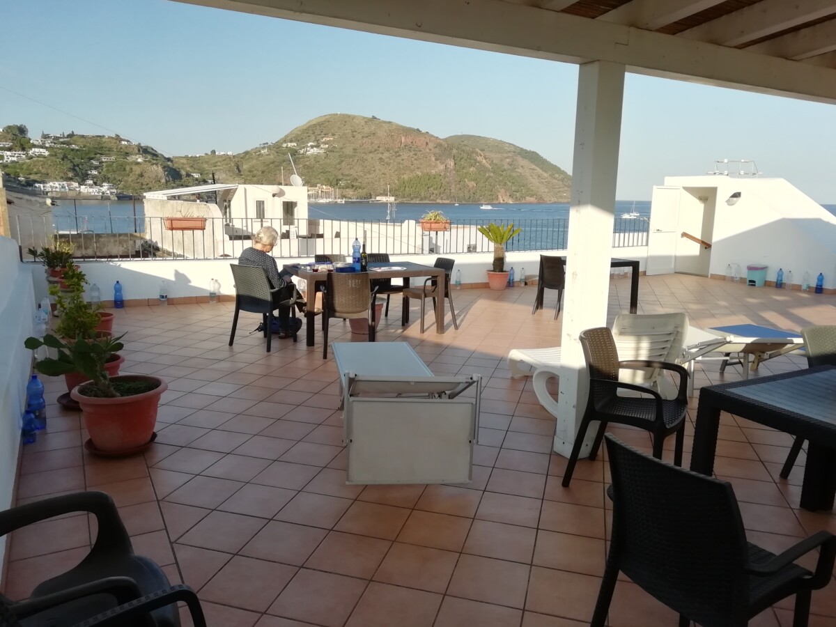Bartolomeo kende iedereen en hij liet ons ook al gauw met heel wat mensen kennismaken. De hele communicatie verliep trouwens voor die tijd wonderlijk: we spraken geen enkele taal gezamenlijk, alleen brokstukken, dus we wisselden Google translate-vertalingen met elkaar uit. Kamer 4 van zijn pension, tweede etage, bleek enorm multifunctioneel: slaapkamer, eettafel, keuken – goed uitgerust, maar in een soort kast, balkon met waslijnen, maar vooral ook een verdieping hoger een ruim dakterras waar we al gauw het liefst verbleven (kon ook heerlijk met 20-23 C. en zachte wind). In de namiddag 3x in bijna alle windrichtingen en door ‘alle’ straten, steegjes en trappen van Lipari gestruind, alles wat we nodig hadden gekocht en al een keuze aan restaurants van buiten bekeken. Bij de laatste avondwandeling heerste er een feeërieke sfeer in het wirwar van straten, steegjes, pleinen en in de haven.