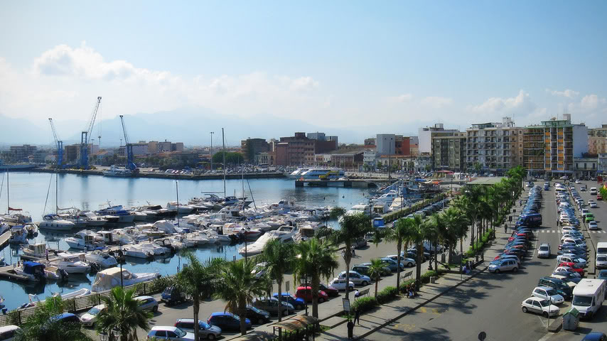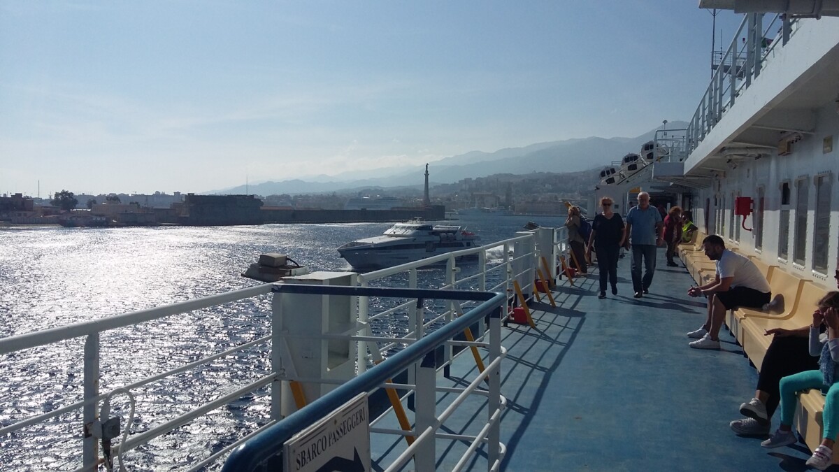6 oktober: Na een goed ontbijt en een erg lekkere koffie nabij het station weer eens een lange treinreis van 9.36 – 16.34 uur via Salerno, Paola, Lamezia Terme tot Villa San Giovanno gelegen tegenover het Siciliaanse Messina. Met een snelle ICE door afwisselend, mooi Zuid-Italiaans landschap. Dun bevolkt, veel heuvels en bergen, af en toe stukken langs de Middellandse Zee met badplaatssferen, maar lang niet zo hoog als in Rimini, Ancona e.o. Ook de landbouw was er minder eenzijdig en intensief. Regelmatig wezen we elkaar op fantastisch gelegen kleine, middeleeuwse stadjes en dorpjes, boven op een berg, zoals in mooie Italiaanse films. Daarna werd het ineens heel spannend: de voorbereiding, uitvoering en afronding van de treinovertocht (ja!) per schip naar Messina!!