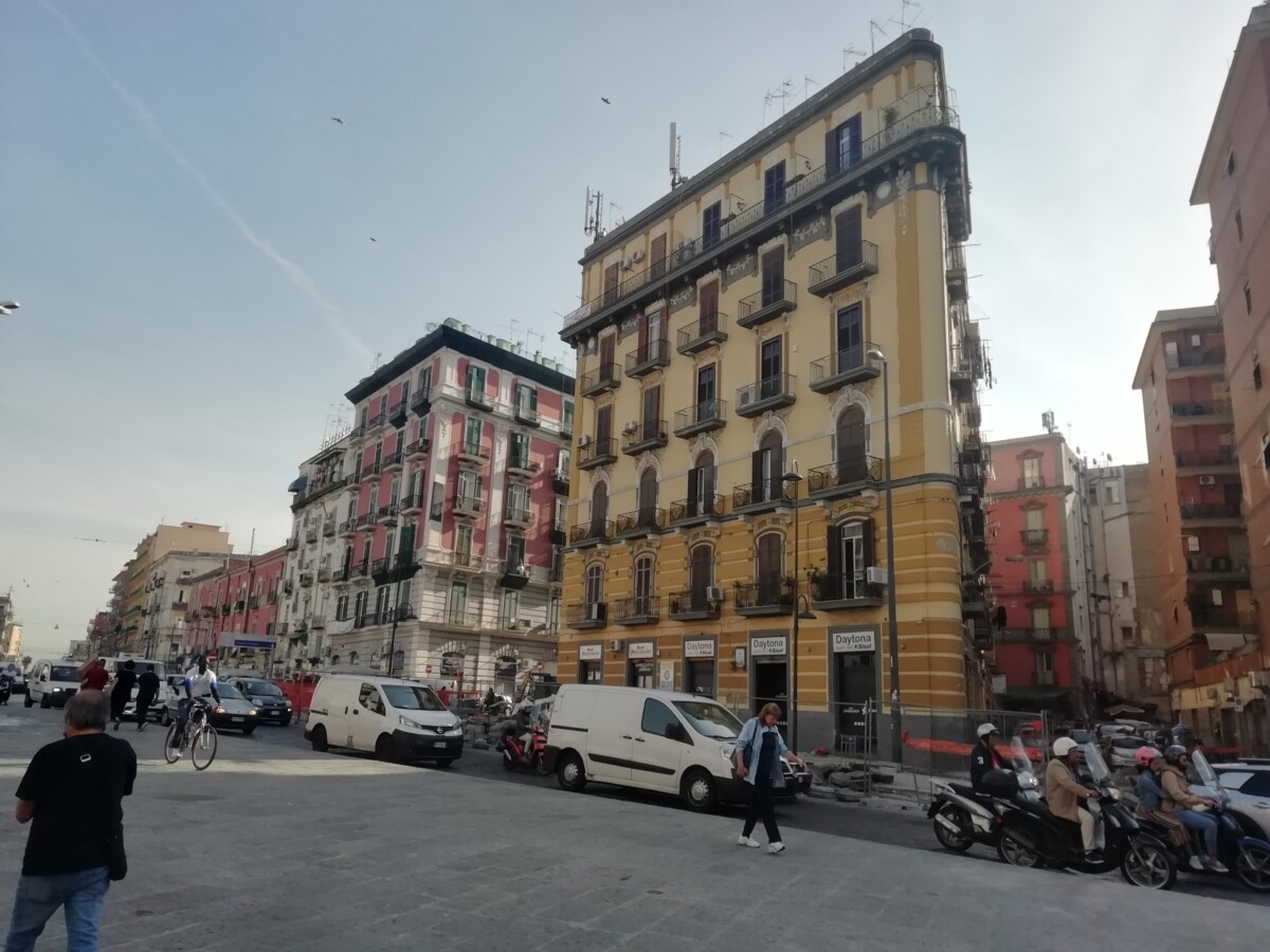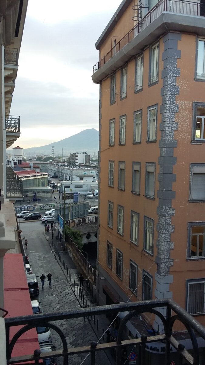 Dat lukte ook, o.m. door hulp van een reisbureaudame en Emely, een Amerikaanse bleek later, die ook vast vertrouwde in een bus naar het 4 km verderop gelegen station. Lukte ook uiteindelijk, na 4 andere buschauffeurs lastig te vallen, en dan ook nog gratis. Waarom?? Compensatie voor het leed op de heenreis? Emely bleek ook nog een aardige partner te hebben, en we overbrugden de busreis, het wachten op de trein naar Napels/Rome, en een groot deel van de treinreis met aardige gesprekken over onze wederzijdse vakanties, verschillen tussen Europa en de VS, gepensioneerd te zijn, maar toch ook over werk dat we voor ons pensioen gedaan hadden. We passeerden weer met onze trein op de boot Messina naar Villa San Giovanni – ook de tweede keer bleef het een heel bijzonder spektakel! In Salerno stapten Emely en haar man na een gezellige, onderhoudende reis samen over op een supersnelle trein, Frecciarossa (Rode Pijl), naar Rome. We arriveerden volgens plan om 19.15 uur in Napels en vonden gauw ons schone, basic pension in een wonderlijk oud woningbouwcomplex met binnenhoven, 5 (!) trappenhuizen van A-E, 6 verdiepingen hoog met zelfs enkele bedrijfjes, winkels en kantoren binnen het carré. Een dorp in de grote stad. De eerst wat norse eigenaar werd vriendelijk na een bescheiden tip, sleepte onze grootste rolkoffer naar de lift en liet ons trots vanaf ons tijdelijk balkon de Vesuvius zien: kamer met vulkaan in zicht!