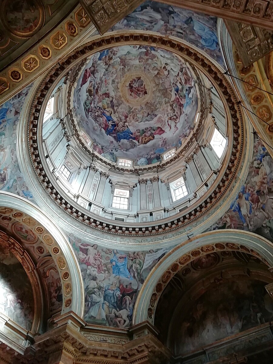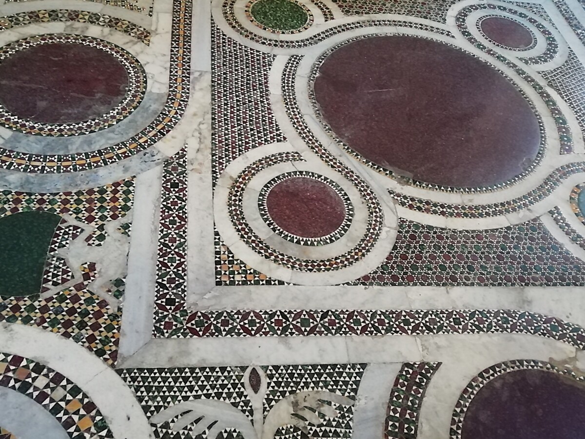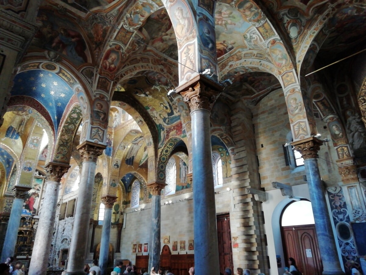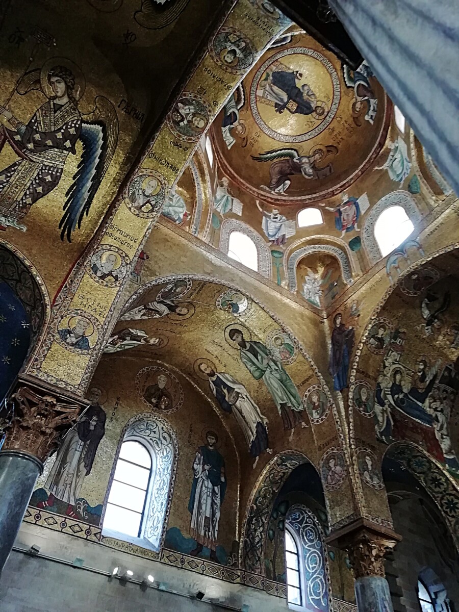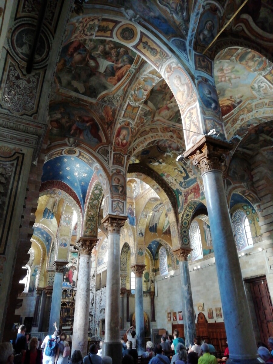 Maar Marianne voelde zich niet goed, duizelig. Teveel drukte, lawaai, indrukken?!? Even thuis op het bed gaan liggen. Gelukkig liet de druktemaker van een eigenaar ons met rust bij het schoonmaken. De duizeligheid van Marianne werd niet echt minder. Even wat lunchen tegen 12 uur hielp weinig. Zij dacht aan lage bloeddruk, gebrek aan zout (zit niet in het Italiaanse brood b.v.). Dus een bouillon maken (hebben we gelukkig altijd mee) en dan weer rusten. Tegen 16 uur besloten we samen dat Willy nog even een ‘wereldwonder’ alleen mocht bewonderen: de Chiesa di Santa Maria dell’Ammiraglio: een schitterende, relatief kleine kerk volledig onder de muur-, zuilen-, koepel- en plafondschilderingen in kleine mozaïekscherfjes (vooral) en verf.
