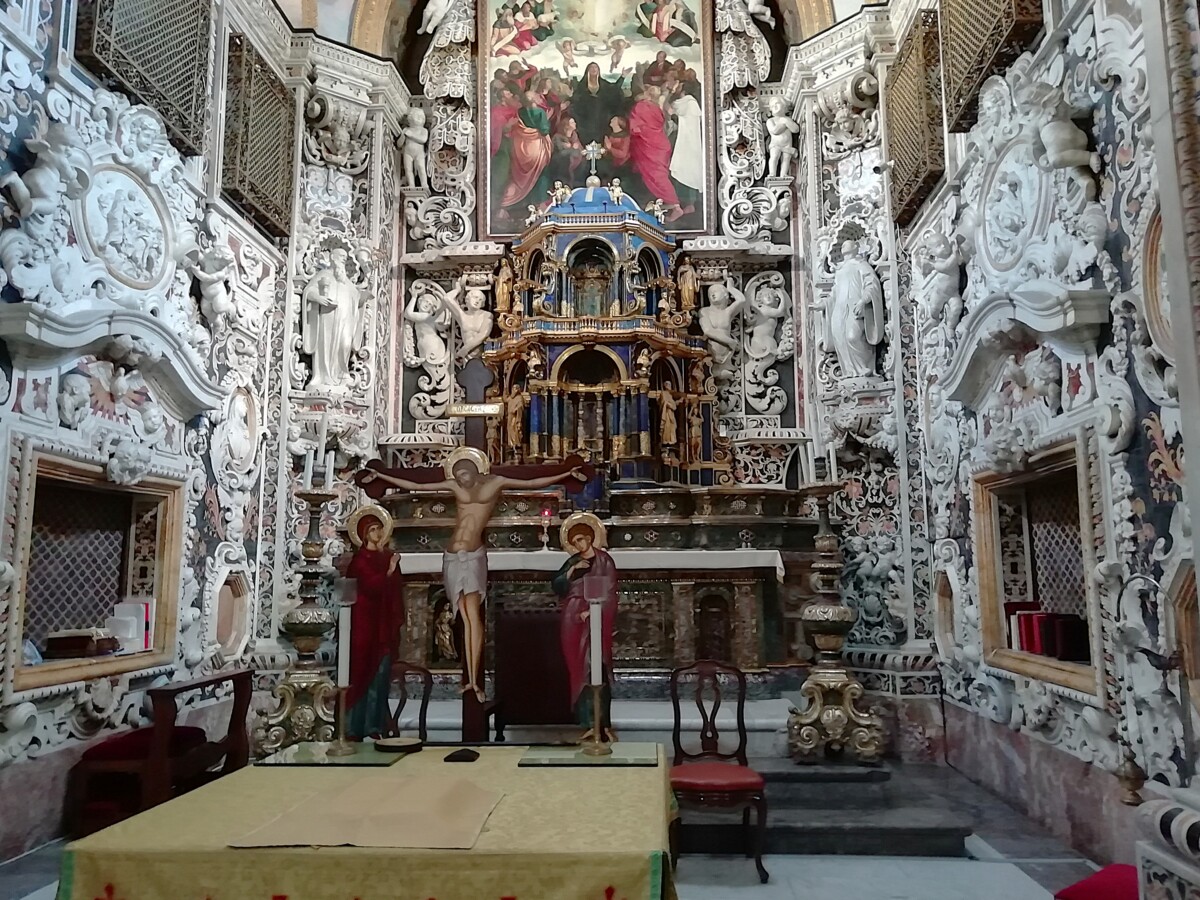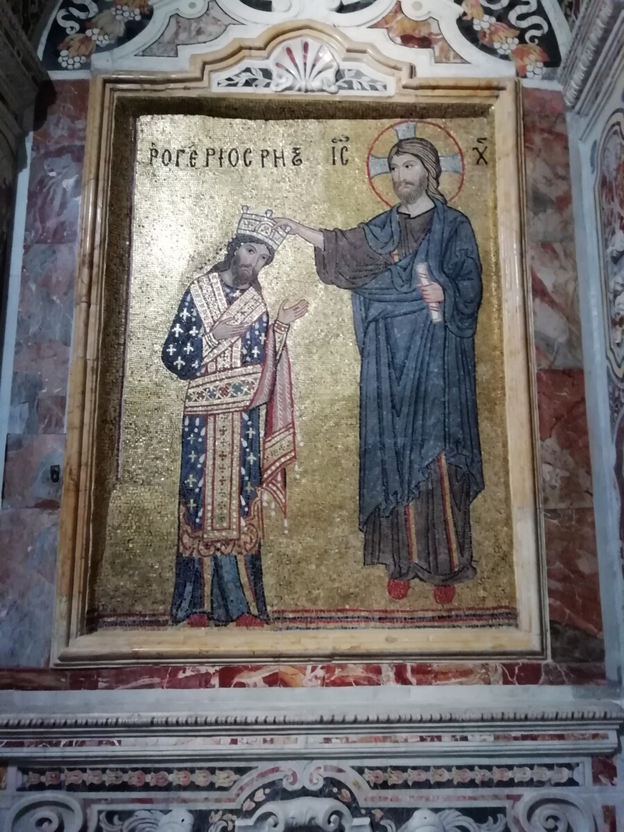 Een bewogen geschiedenis, ook letterlijk, want de kathedraal werd diverse keren zwaar beschadigd door aardbevingen. Binnen en buiten zie je zodoende een enorm eclectisch geheel: binnen b.v. een zichtbare rij Korinthische zuilen, een Griekse vaas als doopvont, buiten b.v. kantelen uit de Normandische periode. Wat zijn Sicilië, Italië als geheel, toch ongelofelijk rijk aan godsdienstgebouwen!
