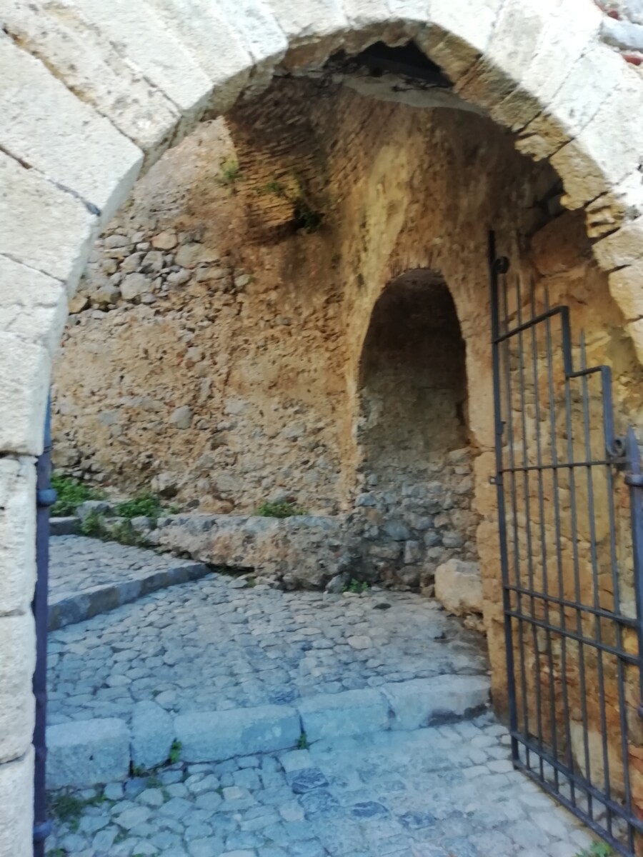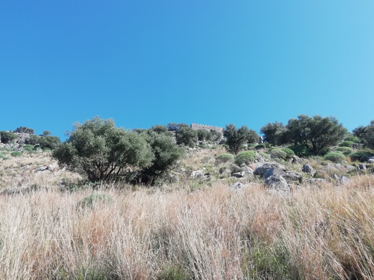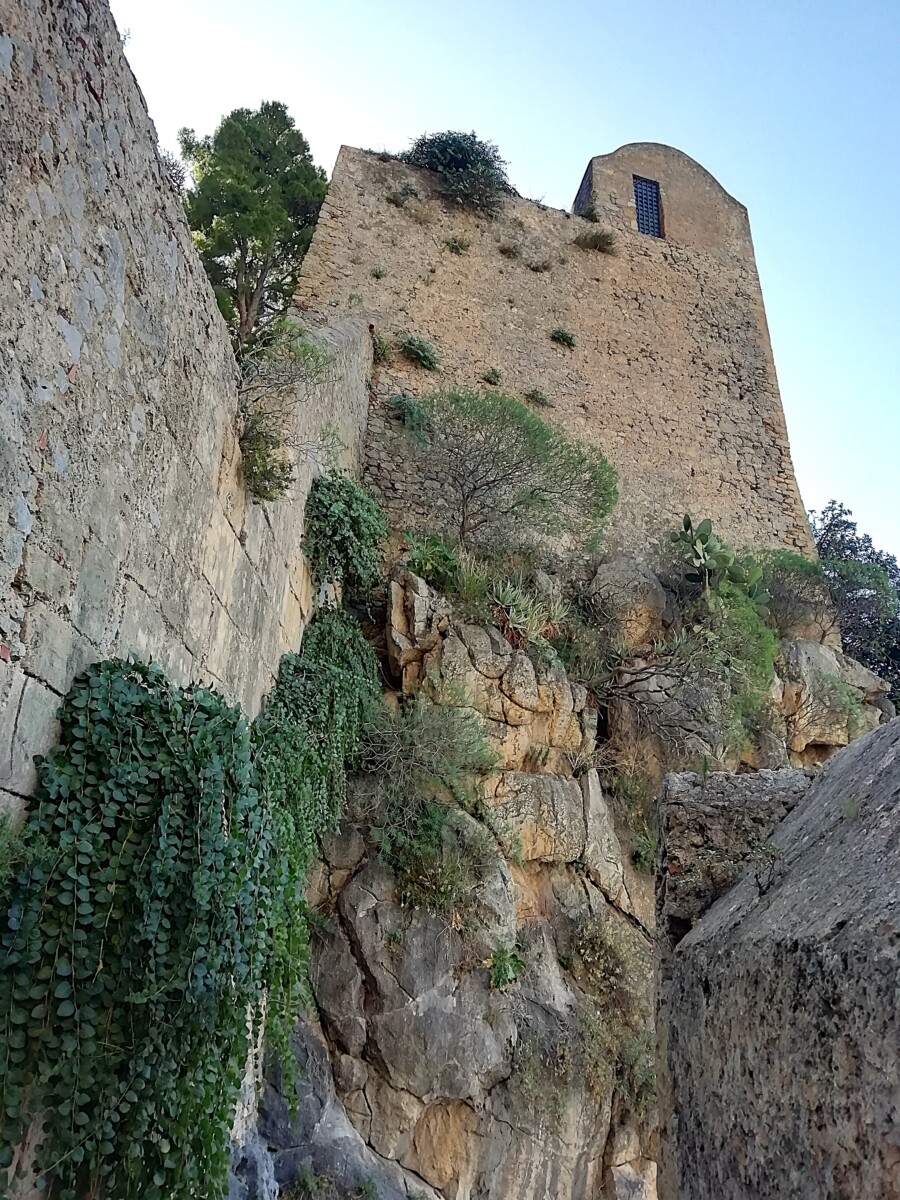 Even buiten de oude bebouwing kwamen we bij een wachthuisje waar 3 mannen bij een hypermoderne automaat kaartjes verkochten voor het bergterrein inclusief (pre-)historische gebouwen, muren langs de de zee, castello etc. 4 euro voor twee pensionado’s. Gezien de moeizaam, stenige klim hadden ze die eerder aan ons kunnen betalen…. Maar ja, de uitzichten en menselijke bouwprestaties te mogen zien en bewonderen waren eerlijk gezegd een vermogen waard! Het begin tot de fortificatiepoort was nog een makkie.