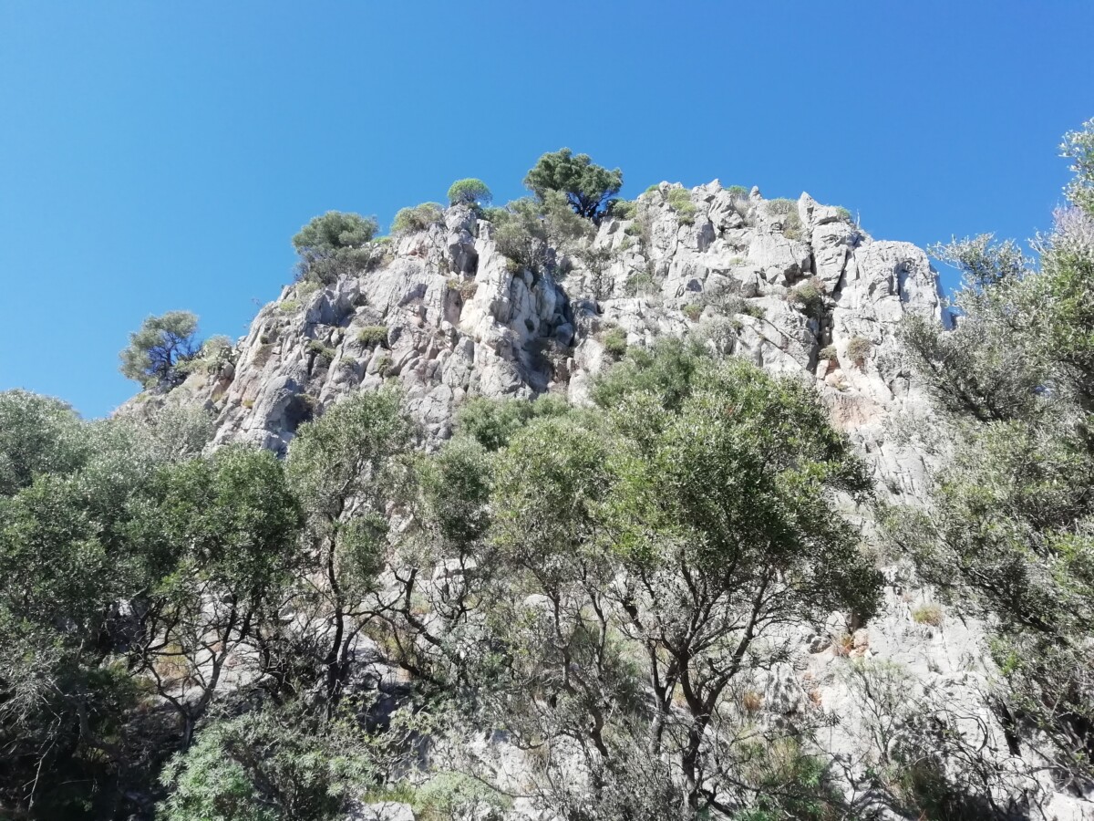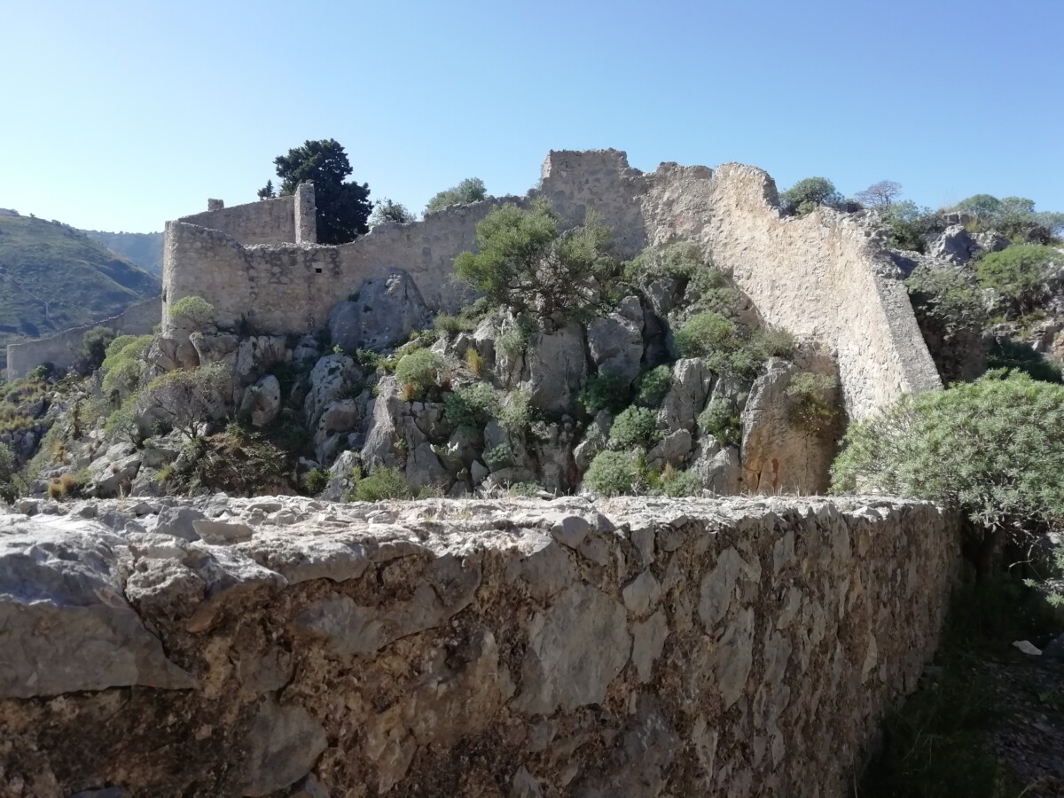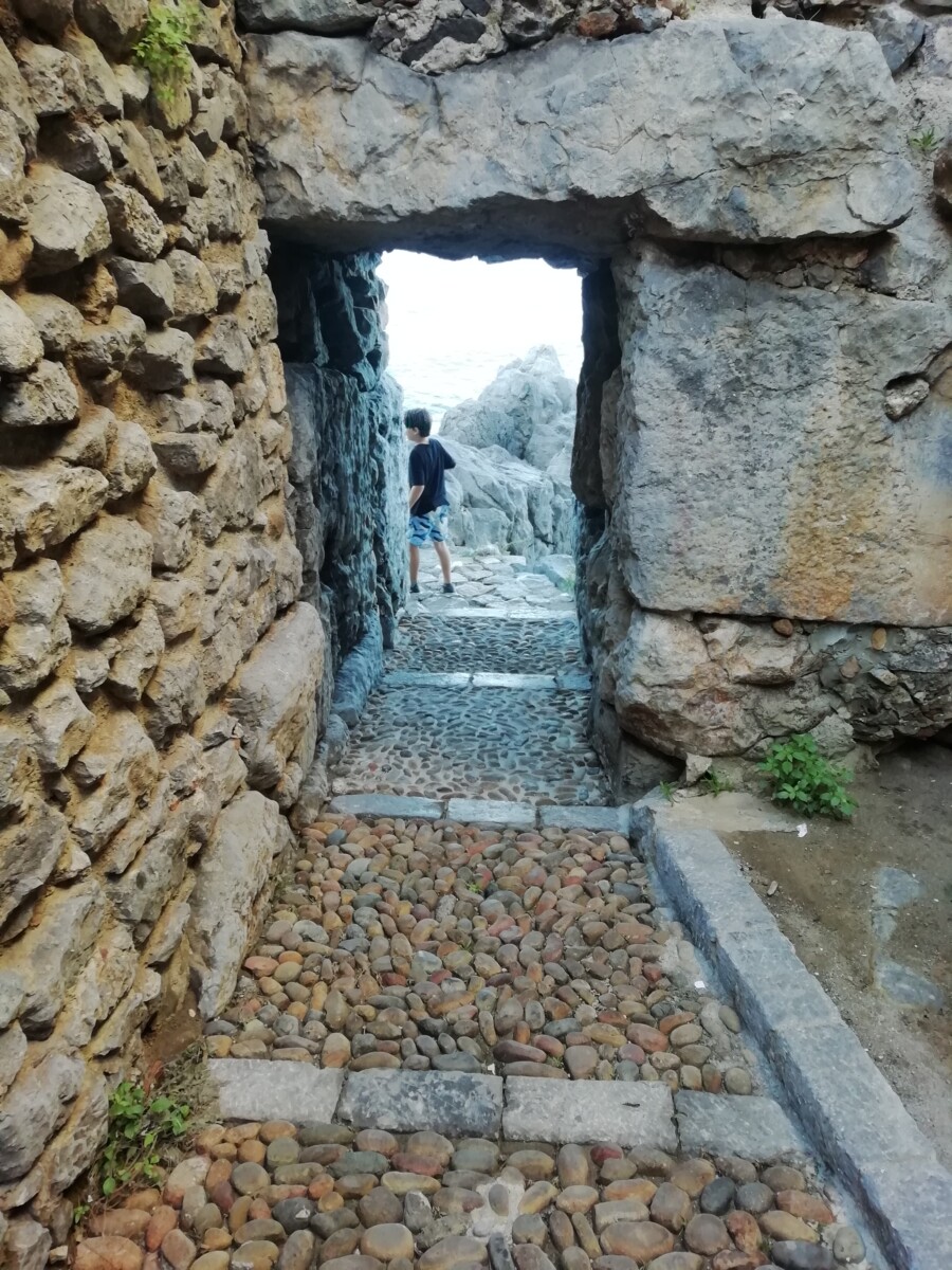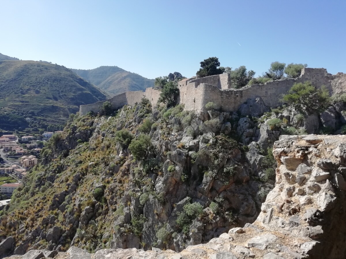 Even buiten de oude bebouwing kwamen we bij een wachthuisje waar 3 mannen bij een hypermoderne automaat kaartjes verkochten voor het bergterrein inclusief (pre-)historische gebouwen, muren langs de de zee, castello etc. 4 euro voor twee pensionado’s. Gezien de moeizaam, stenige klim hadden ze die eerder aan ons kunnen betalen…. Maar ja, de uitzichten en menselijke bouwprestaties te mogen zien en bewonderen waren eerlijk gezegd een vermogen waard! Het begin tot de fortificatiepoort was nog een makkie.