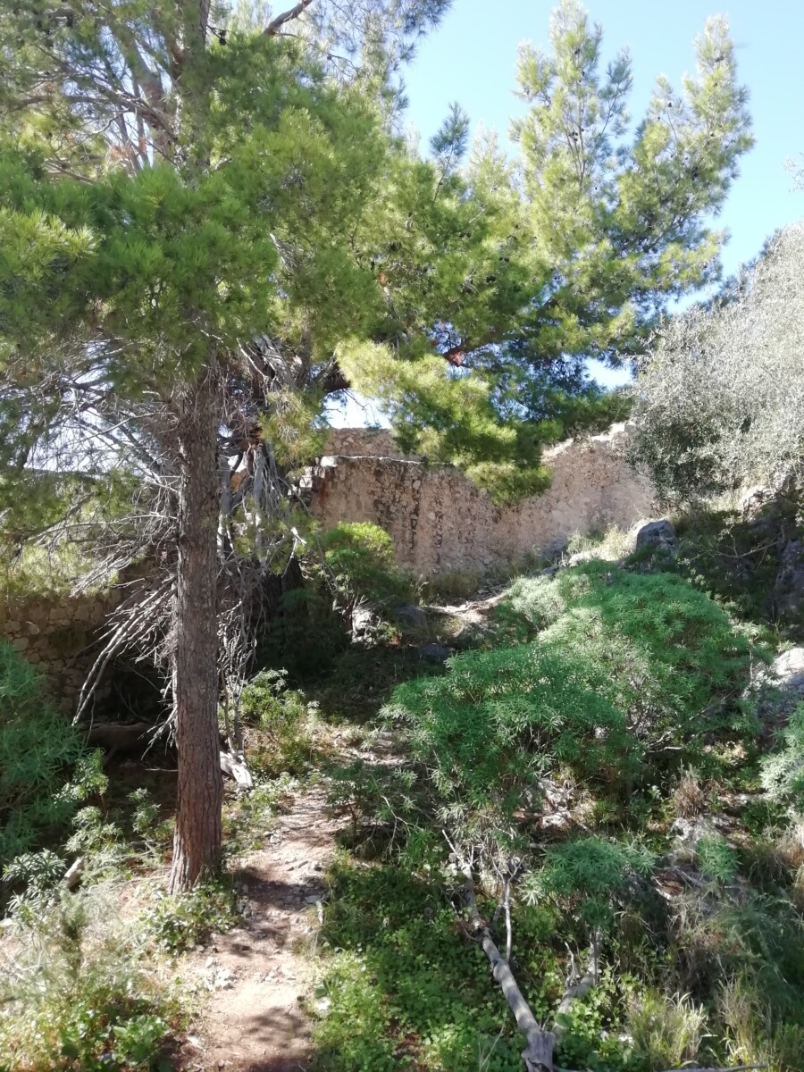 Hierna werd het terrein ruiger: een klein bospad, met soms venijnige rots stukjes, geen probleem op zich, alleen Willy’s hoogtevrees werd op de proef gesteld met een geitenpaadje een meter of 2 langs dodelijke afgronden en waanzinnige vergezichten – niet naar kijken!!! Doorlopen, terug heeft geen zin meer… en dan kwamen we gelukkig bij de zg. Byzantijnse muur, een fortificatie van muren die de noord-, oost- en zuidkant van de heuvel omsloten, soms wel twee meter breed, met kantelen, soms ruïnes, soms nog 5-10 m hoog, in wilde bochten, ongelofelijk werk, maar heerlijk voor Willy!