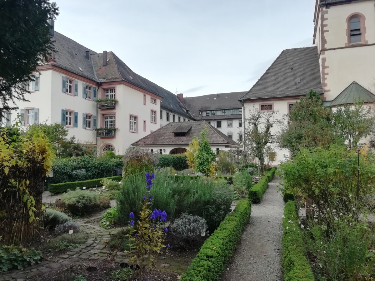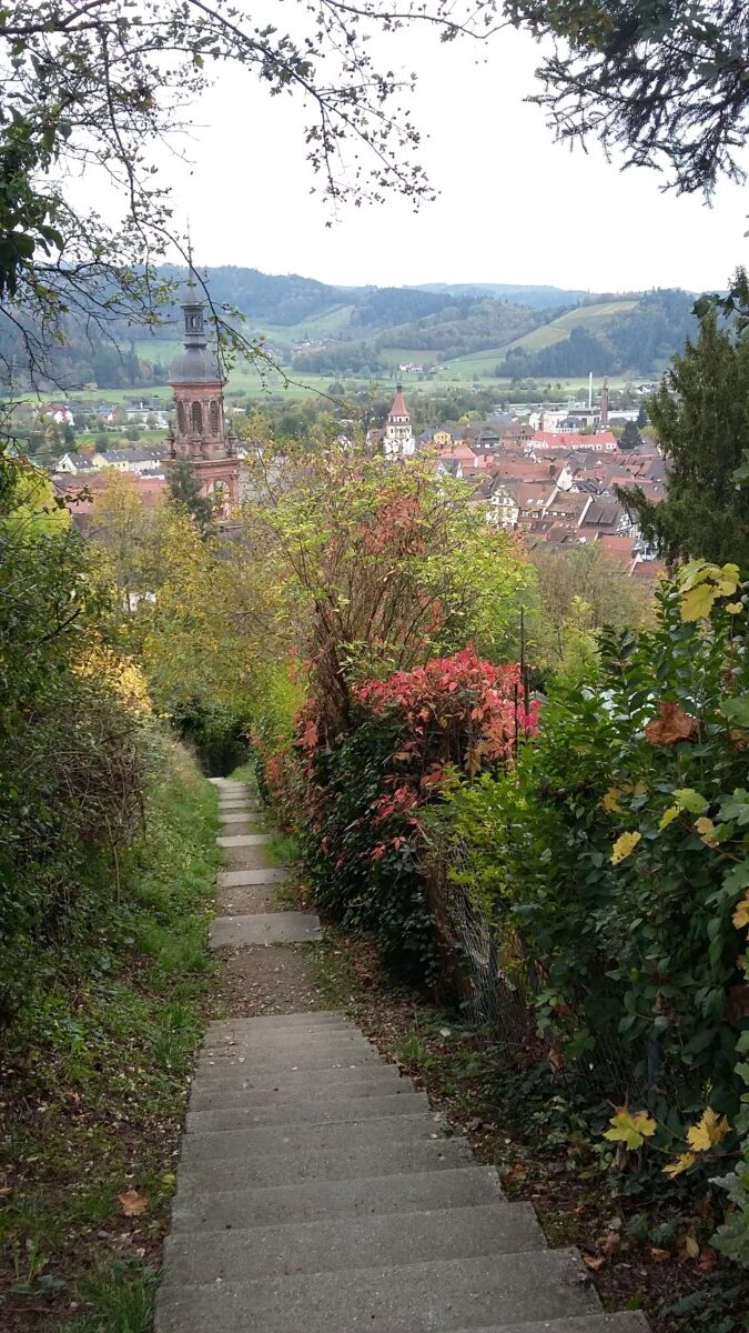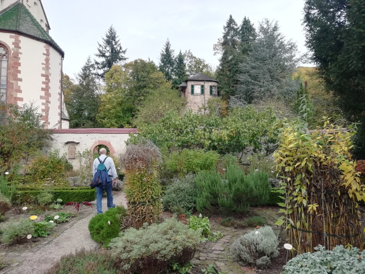 We genoten van het rondstruinen, elke pauze op een bankje of terrasje om uitrustend rond te kijken. Ontdekten een heerlijke kruidentuin achter de grote Benedictijner kloosterkerk, gingen rustig zitten en mijmerden over onze (nabije) toekomst. Heerlijk! Ondertussen liep het stadje vol met zondagse toeristen uit de buurt maar vooral ook het nabijgelegen Frankrijk; gewoon een fijne internationale sfeer. Na een tijdje opzuigen van kleinsteedse cultuur – we bezochten een prachtige kloosterkerk met bijzondere muur- en plafondschilderingen, een fraaie kansel, een maquette met het Bijbelse verhaal (nooit zo gezien) – besloten we nog een mooie korte wandeling door bosjes en wijnbergen met de gedroomde vista’s op het prachtige stadje te zoeken.