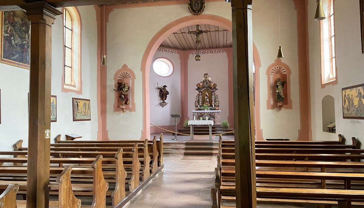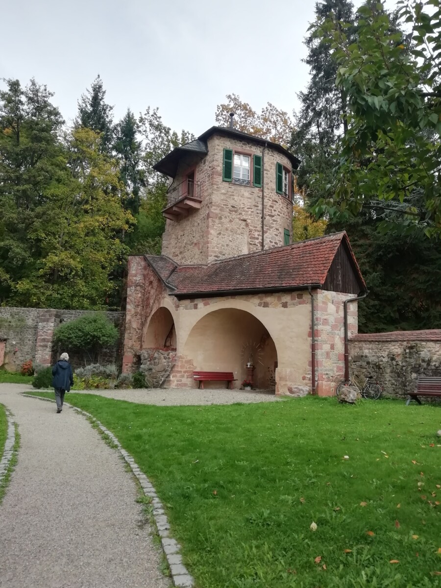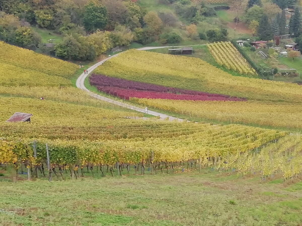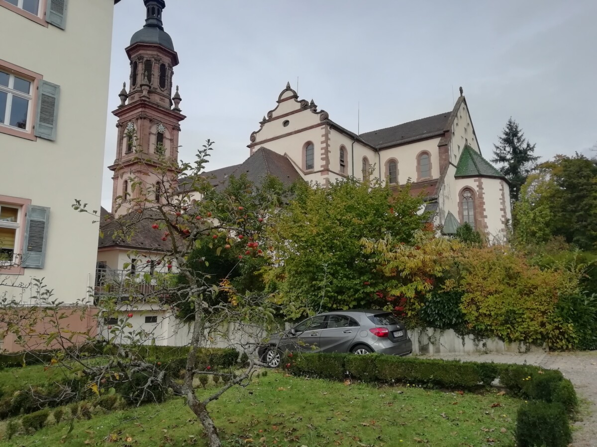 We genoten van het rondstruinen, elke pauze op een bankje of terrasje om uitrustend rond te kijken. Ontdekten een heerlijke kruidentuin achter de grote Benedictijner kloosterkerk, gingen rustig zitten en mijmerden over onze (nabije) toekomst. Heerlijk! Ondertussen liep het stadje vol met zondagse toeristen uit de buurt maar vooral ook het nabijgelegen Frankrijk; gewoon een fijne internationale sfeer. Na een tijdje opzuigen van kleinsteedse cultuur – we bezochten een prachtige kloosterkerk met bijzondere muur- en plafondschilderingen, een fraaie kansel, een maquette met het Bijbelse verhaal (nooit zo gezien) – besloten we nog een mooie korte wandeling door bosjes en wijnbergen met de gedroomde vista’s op het prachtige stadje te zoeken.