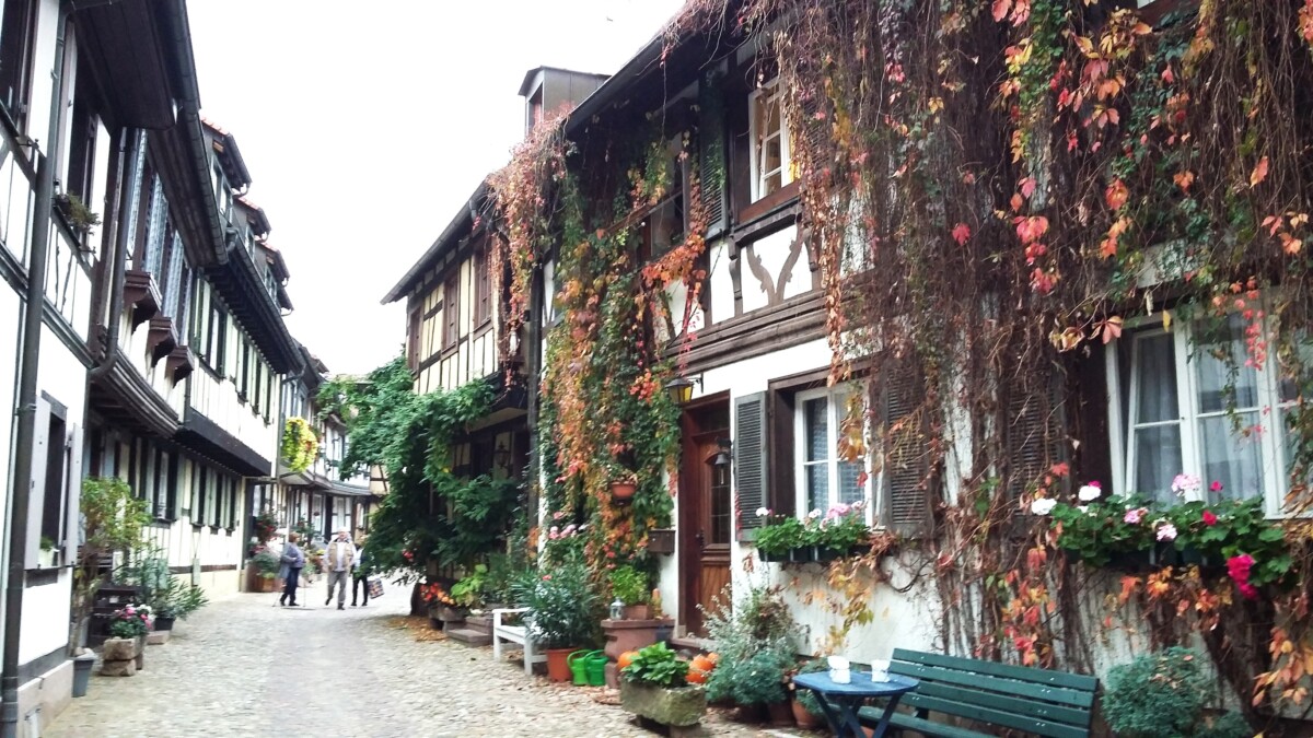 Op woensdag 25 september 2019 zaten we al iets voor 8 uur op de veerboot naar Den Helder. Hester de Beus – die een tijdje op ons huis zou passen – wenste ons al voor vertrek een mooie reis en in de ICE naar Frankfurt mailde Ity Busstra ons een aardige mail, denkend dat niet alleen zij ons zal missen… ja, mensen zouden wij in de toekomst ook best eens kunnen missen, druk werk daarentegen zeker niet! We merkten zelfs dat de buurman in de trein, hard en hectisch werkend tussen Amsterdam en Frankfurt, ons een gevoel gaf van medelijden, gemengd met lichte irritatie. Na drie keer overstappen – Frankfurt, Offenburg, Straatsburg – arriveerden we probleemloos en op tijd op ons adres in Colmar, een leuk appartementje / tiny house in de tuin van een jong stel dertigers. Eerste indruk prima, en dan gauw de stad in voor wat boodschappen waaronder een haarborstel die we vergeten waren. Het eerste weerzien met Colmar in de schemer beviel uitstekend en wekte alvast enige voorvreugde.