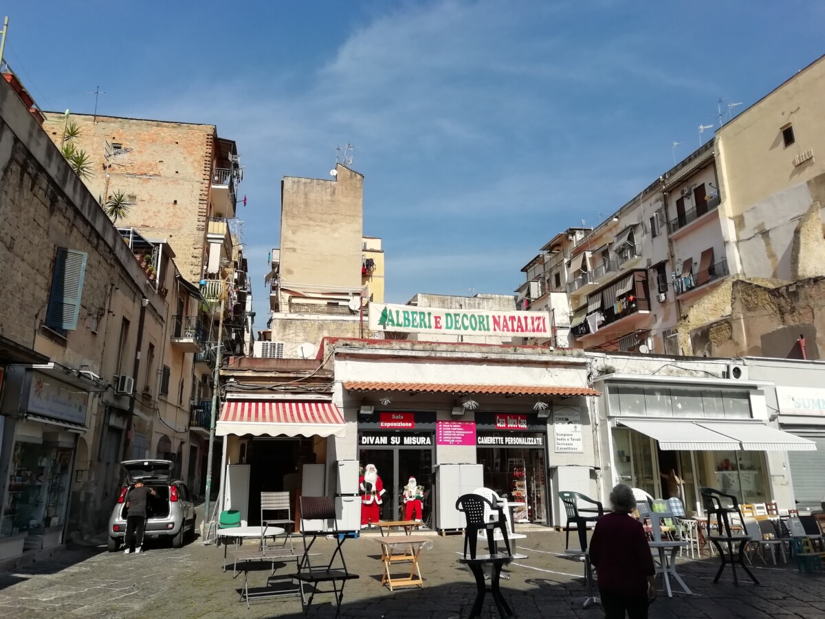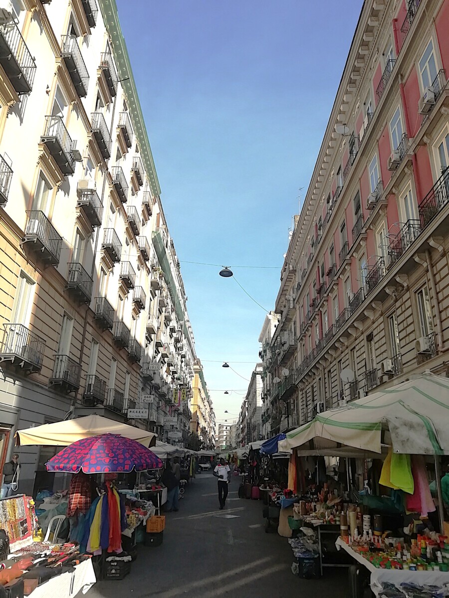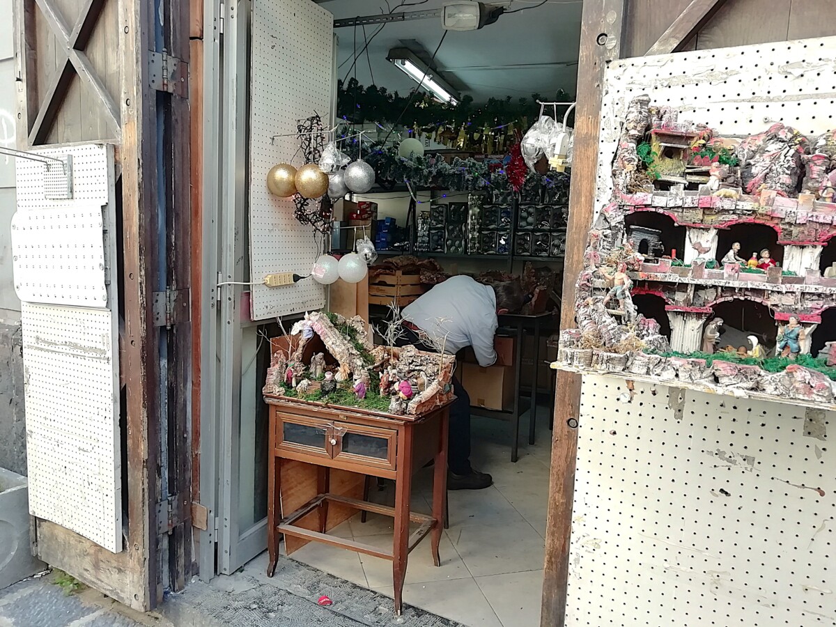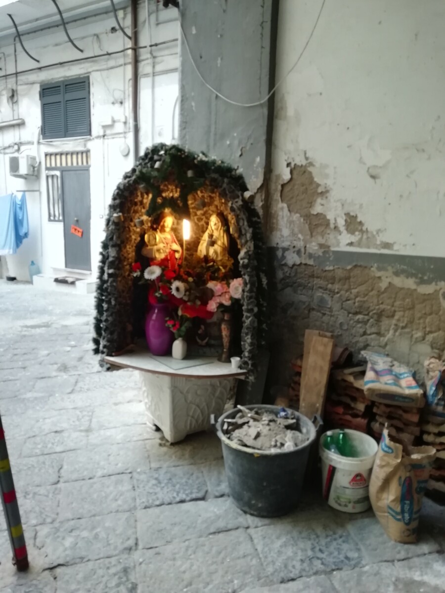 Napels blijkt een mix van statige, hoge gebouwen, één stijl, verschillende kleuren, brede lanen (corso’s) en tussenin een meer kashba-achtige wirwar van kleine straten en straatjes. De stad leek ons – afgezien van de representatieve hoofdstraten en de omgeving van de kathedraal – zelfs in vergelijking met Palermo, viezer en rommeliger. Derde Wereld in Europa heet dat dan al gauw. Toch heeft de stad ook grandeur, vooral uit vroegere tijden (2e helft 18e eeuw b.v.), met de obligate kerken, het (bij)geloof op elke hoek, zo alledaags. Zo zagen we 2 werkplaatsen voor de bouw van aandoenlijke kerststalletjes en aten we ’s avonds in een trattoria annex huiskamer, televisie keihard aan, waar de eigenares en een bezoeker een hele rozenkrans mee zaten te bidden met de televisiepastoor, hard op (het was tenslotte Mariamaand).