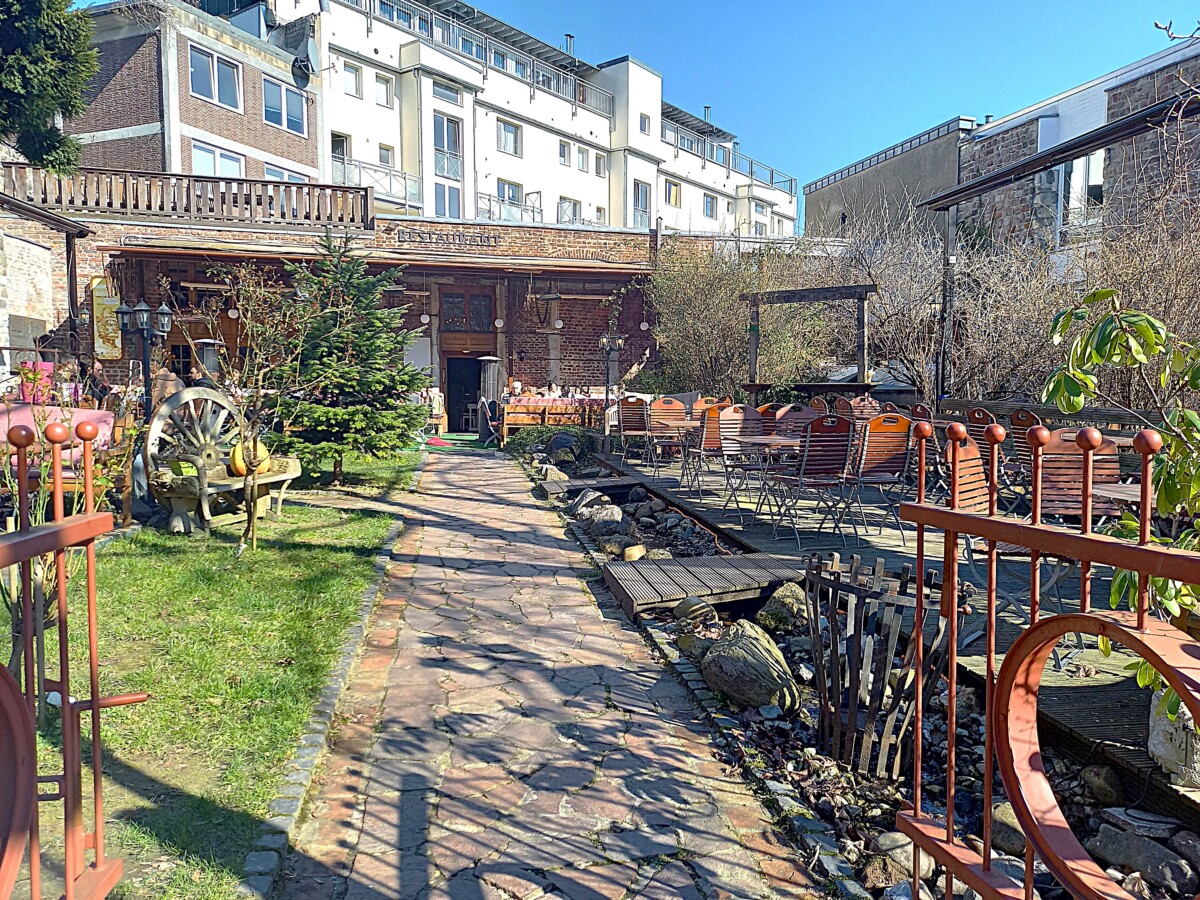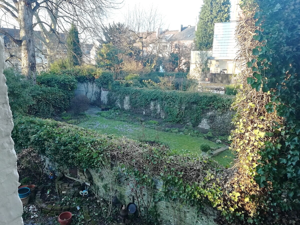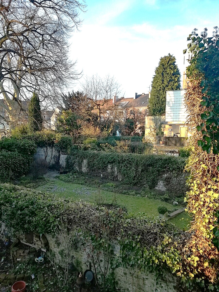 28 februari, een dag voor Willy’s verjaardag, begonnen we deze reis, redelijk zwaar bepakt (o.a. ook nog een rugzak vol etenswaren), wandelend naar de nabije veerhaven van Texel. De boot van tien uur bracht ons, zoals bijna altijd, betrouwbaar naar Den Helder, waar ons treinavontuur begon: via Alkmaar naar Maastricht, op Rosenmontag, dwars door Carnavalsgebied, maar ook met fraaie uitzichten in het rivierengebied op hoogwater en de eerste sleedoornbloei! Dankzij een ‘gratis’ keuze dag van de NS permitteerden we ons de luxe, 1e klas te reizen, om de grootste gekostumeerde drukte tussen Utrecht en Zuid-Limburg alleen van een afstandje te hoeven beleven. Om 16.20 uur arriveerden we in Aken op het hoofdstation en vonden we probleemloos het adres waar we een week zouden logeren. De ruimte paste precies in het beeld dat we verwachten, nog wel aangevuld met een onvermeld gebleven uitzicht op heerlijke oude binnenstadstuinen.