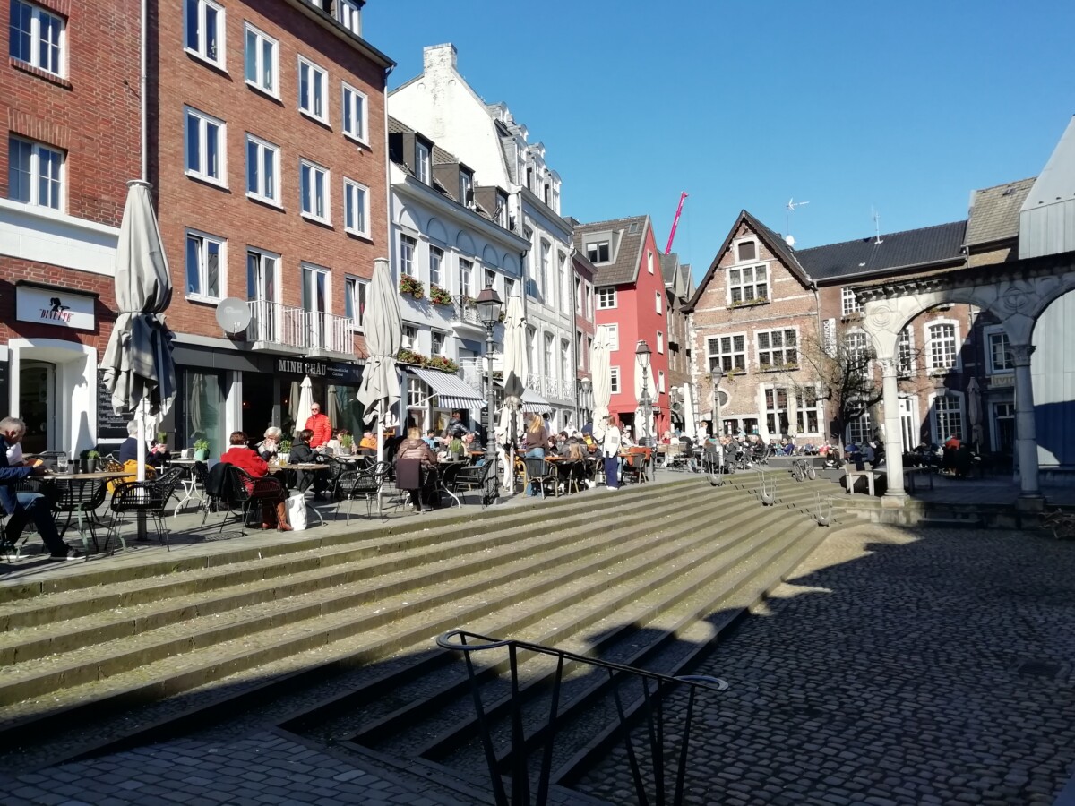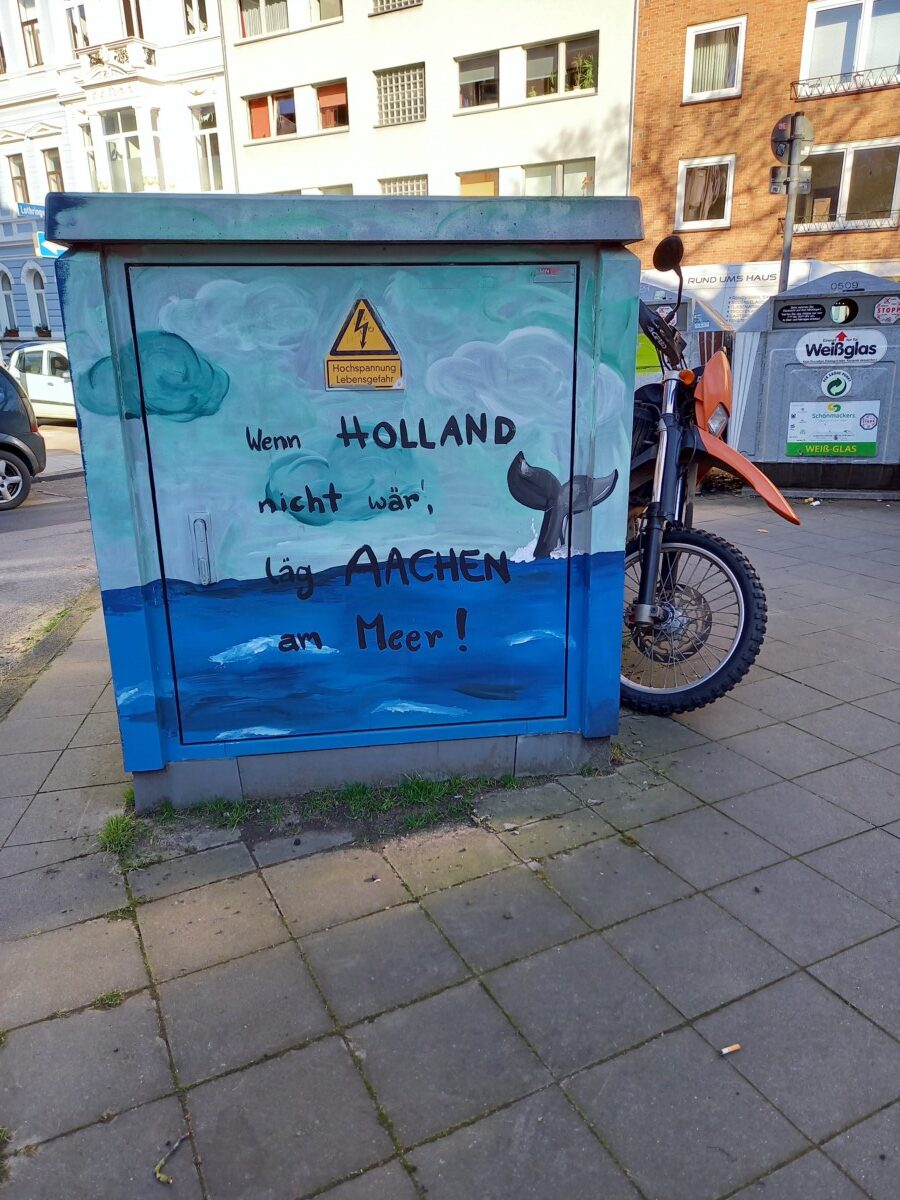 Van het stadhuisplein, de Markt, dwaalden we door straten, steegjes en pleinen waar we overal mensen van de eerste lentezon zagen genieten. Uiteindelijk bereikten we het Szeneviertel Frankenbergerstrasse. Aardige wijk voor jonge gezinnen, groen, levendig, wel minder creatief, ruig dan we hadden verwacht – toch meer een nette, brave stad, Aken.
