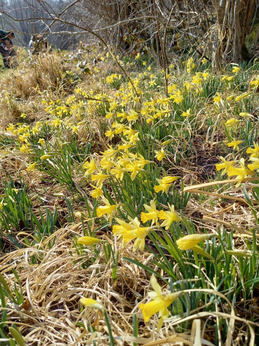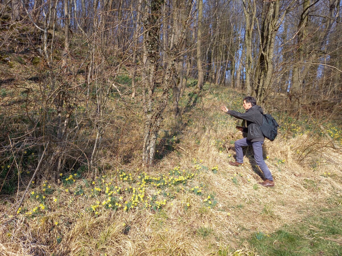 Vandaar dan verder door bos en veld tot kasteel Thor (ook mooi, oud en gammel), notabene te koop! Toch even een beetje in dromenland… Verder door ‘Limburgs’ terraslandschap met heggen, door de weiden lopend richting Lontzen onder langs het staatsbos Hohnbachtal. Daar, tegen prachtige hellingbossen aan, groeien miljoenen Wilde narcissen, waarvan de eerste 10% al in bloei stond. En dan met de zon de eerste insecten en mensen die tegen de bosrand aan in de narcissengeur zaten weg te zwijmelen. Dat konden we ook niet laten! Nooit eerder gezien, net zo prachtig als Wilde hyacintenbossen ‘bij ons op Texel’: Wilde narcissenbossen en zomen!! (Het NIOZ-bosje bij ’t Horntje kan er wel een beetje mee wedijveren). Weer zo’n kraanvogelmoment (zie boven, 4 maart).