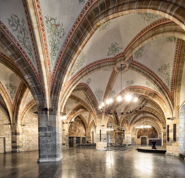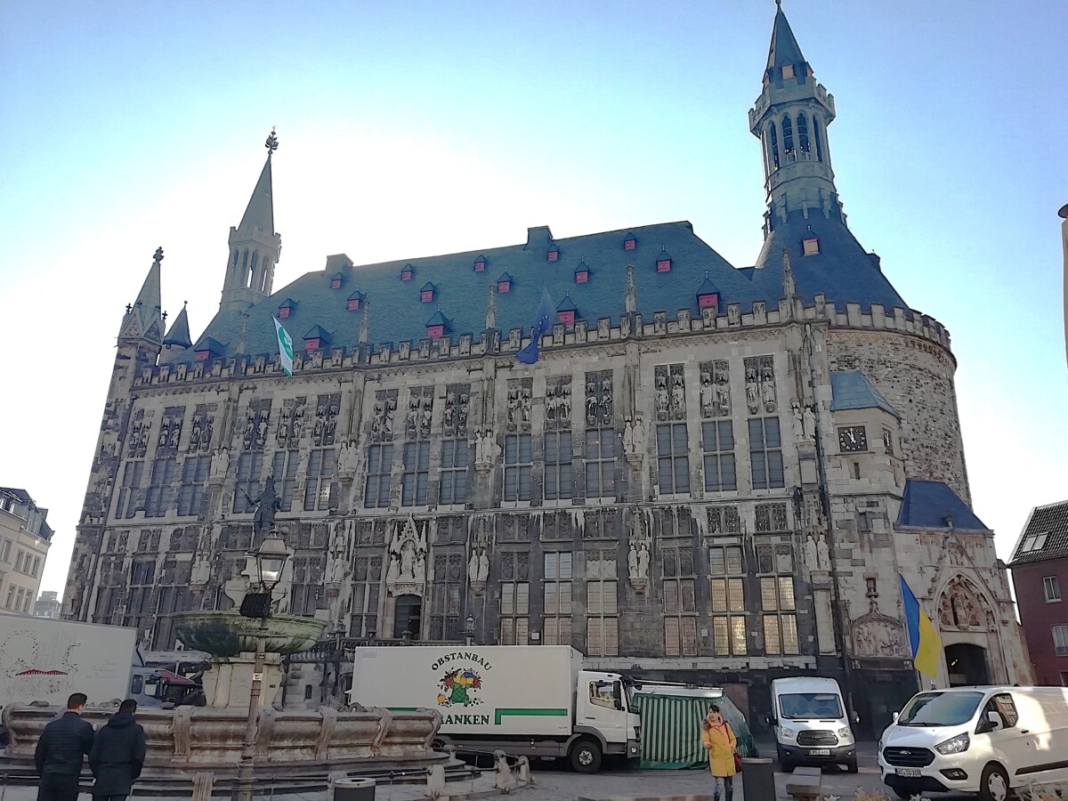 Via de Pontstrasse door de brede, indrukwekkend grote Pontpoort wandelden we vervolgens richting de Lousberg, de groene, parkachtige huisberg van Aken. Recreatief, met uitzichttoren, maar ook een groene long waar je echt de stad uit kunt lopen tot in het omringende landschap. Wij liepen weer terug naar de binnenstad, waar we exact om 12 uur voor restaurant Magellan met een mooie ruime tuin en terras arriveerden: in de zon was het waarachtig warm genoeg om buiten te zitten! We kozen voor een lekkere lunchmaaltijd en genoten van de vroege lentezon en het passende, mediterrane eten. Uitgerust bezochten we hierna het stadhuis met enkele indrukwekkende zalen, met de Grote Kroningszaal als hoogtepunt.