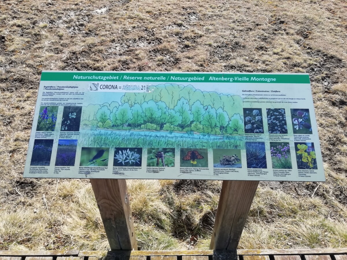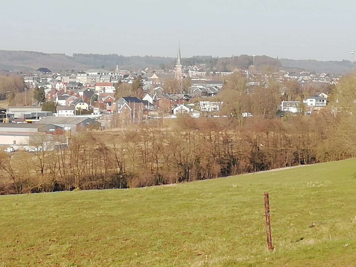 5 maart: Met de bus van 10.04 uur naar Kelmis/La Calamine, een wonderlijk groot dorp/klein stadje, dat van 1814 – 1920 een neutrale zone, Neutraal Moresnet, vormde; een soort vierde landje ingesloten door Nederland, Pruisen/Duitsland en België. Ooit bedrijvig en welvarend vanwege de aanwezige zinkgroeven, onder botanische liefhebbers bekend als groeiplekken voor de befaamde, afwijkende inheemse flora (Zinkflora). We bereikten het centrum van Kelmis al tegen 10.30 uur op de ’typisch Belgische’, drukke (doorgaand verkeer} hoofdwinkelstraat. Op korte afstand van de winkelstraat vonden we gauw, tegenover de kerk, het VVV-kantoor. Een echt heel aardige mevrouw, die met veel plezier gemakkelijk tussen 3 talen switchend, gauw voor een mooie wandelbrochure mit Wanderknotenpunkten, nr. 14, door het Land van La Calamine oftewel Kelmis, zorgde. Weer buiten stelden we al gauw vast, dat het gros van de mensen hier wel een Duits dialect c.q. Hoogduits praat. Een vreemde gewaarwording in typisch Belgische contreien. Wij begonnen onze wandeling bij een Hotel Park, met een Casinoweiher en een soort natuurtuin/instructietuin voor de befaamde zinkflora, mutaties van planten, die zich aan de zware metaalvervuiling van de Geul, La Gueule of Göhle, b.v. gele in plaats van blauw-paarse bosviooltjes, wisten aan te passen.