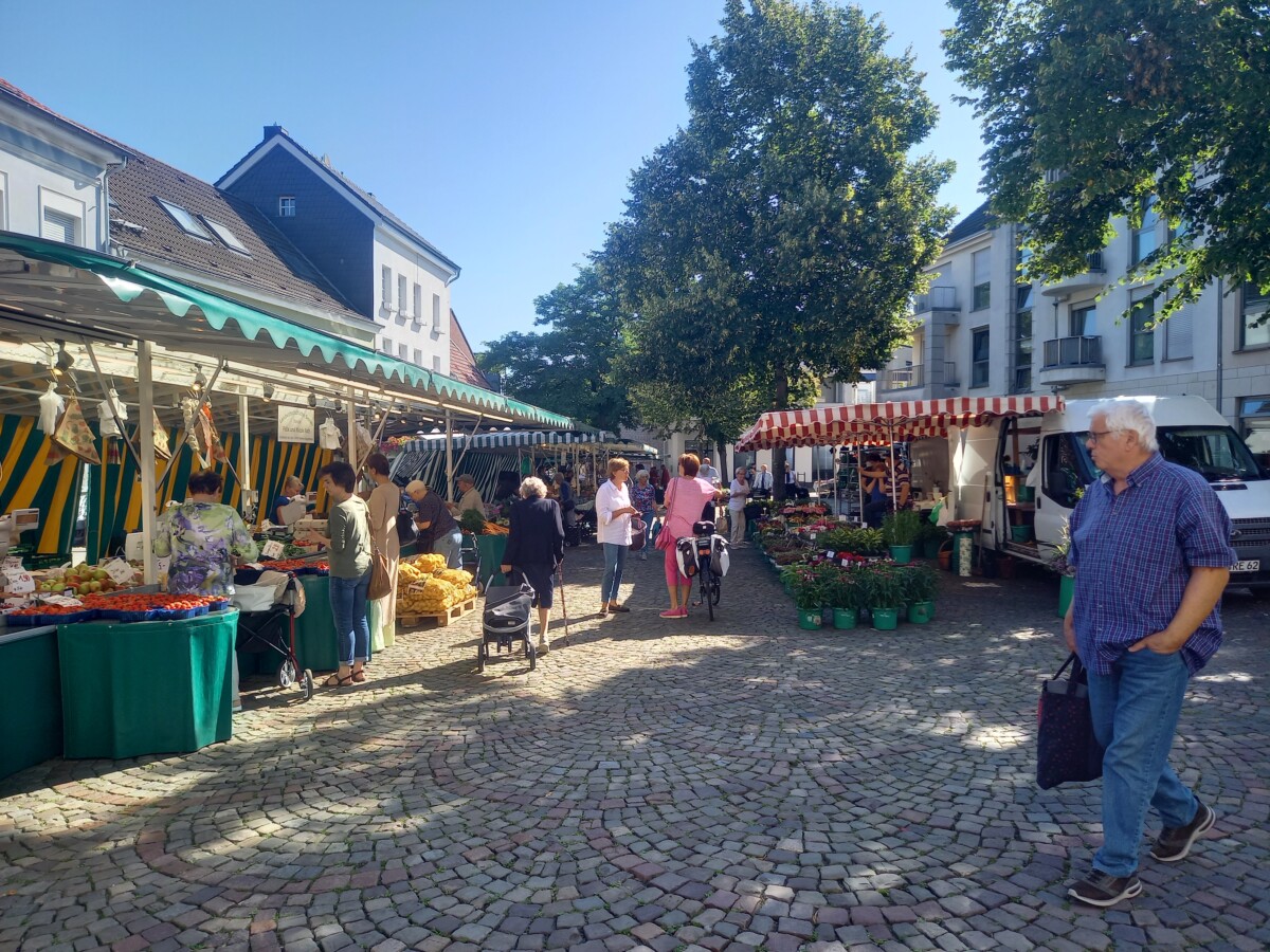 11 augustus: Goed geslapen en heerlijk ontbeten als opstart van Marianne’s 71ste verjaardag. Tegen 9.30 uur stapten we op onze fietsen – goed gepakt, eten en drinken, niets achtergelaten, de route uitgewerkt – en verlieten vrolijk en in verjaardagstemming onze subtropisch-Nederrijnse binnenhof in Lobberich. Het bleef de hele dag, tot 22 uur ’s avonds droog en behoorlijk warm weer (tot 29 C.) – dit even al vooraf. De eerste 10 – 15 km voerden ons door rustig, licht geaccidenteerd landschap, groen, stil, boerenlandschap uit een andere tijd. Prettig, vóór Süchteln zelfs heuvelig tot op de top van een heuvelrug met mooi oud bos (en een Fernmeldeturm op de Süchtelner Höhen, tot 91 m). Süchteln werd de ontdekking van deze dag: aardig landschap rondom, middeleeuws straatpatroon, een oude kerk, veel kleine winkels, een mooie markt. Even fietsen parkeren, rondstruinen en ons blijven verbazen over een tot dan toe onbekend leuk stadje (tegenwoordig stadsdeel van Viersen). In een Duits café tijd voor Kaffee und Kuchen (rabarber- cq. aardbeientaart).
