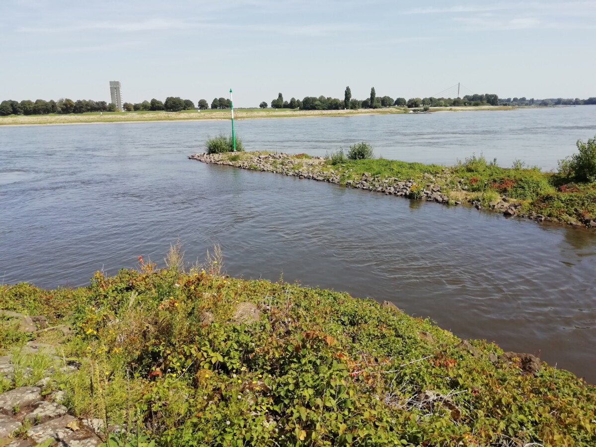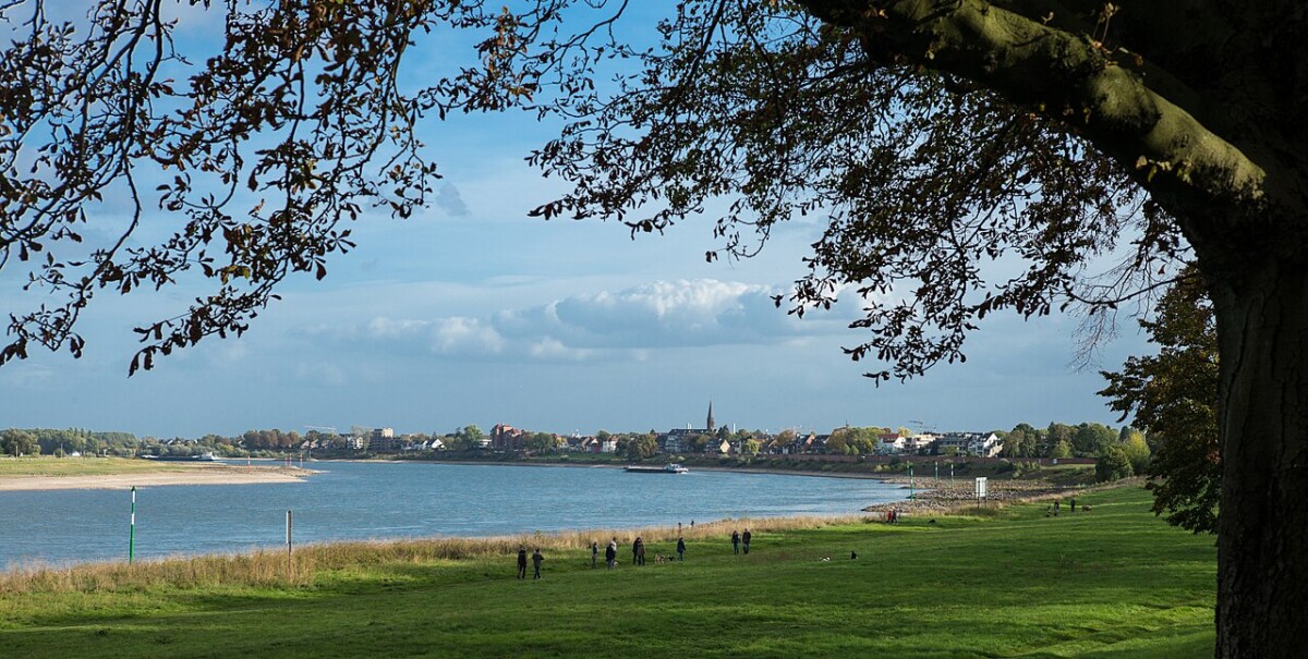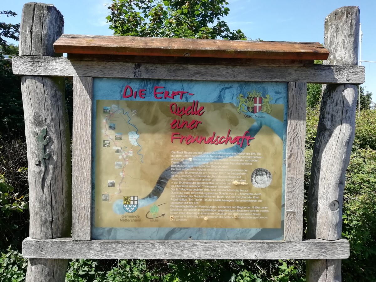 Neuss zelf bleek dan weer een aardig fietspadennet door parken, lanen en plantsoenen tot in de binnenstad en verder tot bij Grimlinghausen aan de Rijn ontwikkeld te hebben. Hier gunden we ons een pauze aan de monding van de Erft, een betekenisvolle kleine rivier voor Willy. Een flink deel van de familie van zijn vader leefde in Wevelinghoven e.o. aan de Erft. Op bezoek bij die familie -vaak saaie verjaardagsfeesten- speelde de Erft in de achtertuinen en boomgaarden van ooms en tantes een spannende rol.