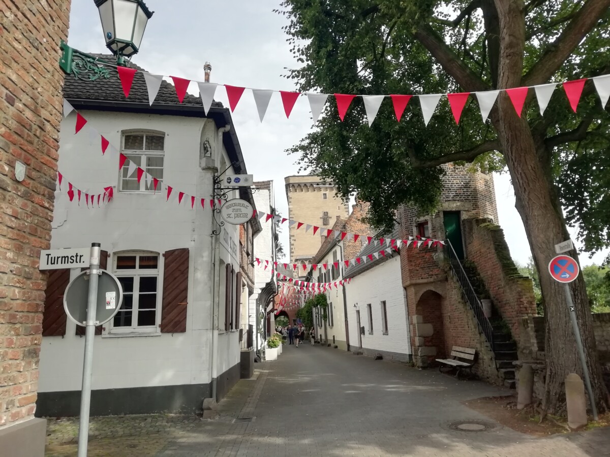 Zondag was het weer dan weer zo gunstig dat ons een fietstocht door en om Willy´s ´opgroeistadje´ Dormagen van ruim 50 km ontspannen en plezierig lukte. We begonnen de dag fietsend tot de oude vestingstad Zons, waar men druk bezig was een feestmiddag en -avond voor te bereiden. Zowel de nervositeit of alles zou lukken als ook blije voorvreugde was alom voelbaar. Maar het was nog rustig, we konden in alle rust van alle kanten de schoonheid van het kleine, volledig ommuurde stadje aan de Rijn bekijken.