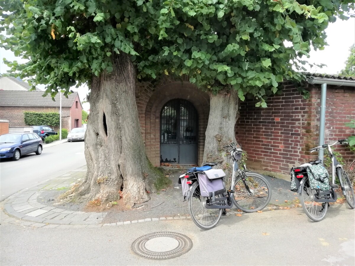 Lang geleden ging Willy hier nog af en toe biechten… Van Knechtsteden fietsten we verder naar het dorpje Ansteln. Om een nieuw golfterrein heen bereikten we Keuls grondgebied door bos en veld tot de Further Hof, die immense boerderij bij Schloss Arff, vlakbij het vroegere erf van Willy´s opa Peter. Ook nog even binnen geloerd in de park-bostuin van de nieuwe eigenaren (best mooi beheerd). Langs het Randkanaal fietsten we vervolgens tot het gehucht Hackhausen. Aan het einde van een slecht geasfalteerde straatje stond, verborgen achter twee geweldige oude lindes, een kapelletje met knielbankje, piëta en een serie foto’s van de ‘gevallenen’ van de beide Wereldoorlogen, waaronder de oudere broer van Willy’s vader, Paul, waarna Willy o.a. benoemd is. Lees hier meer over deze ontroerende plek!