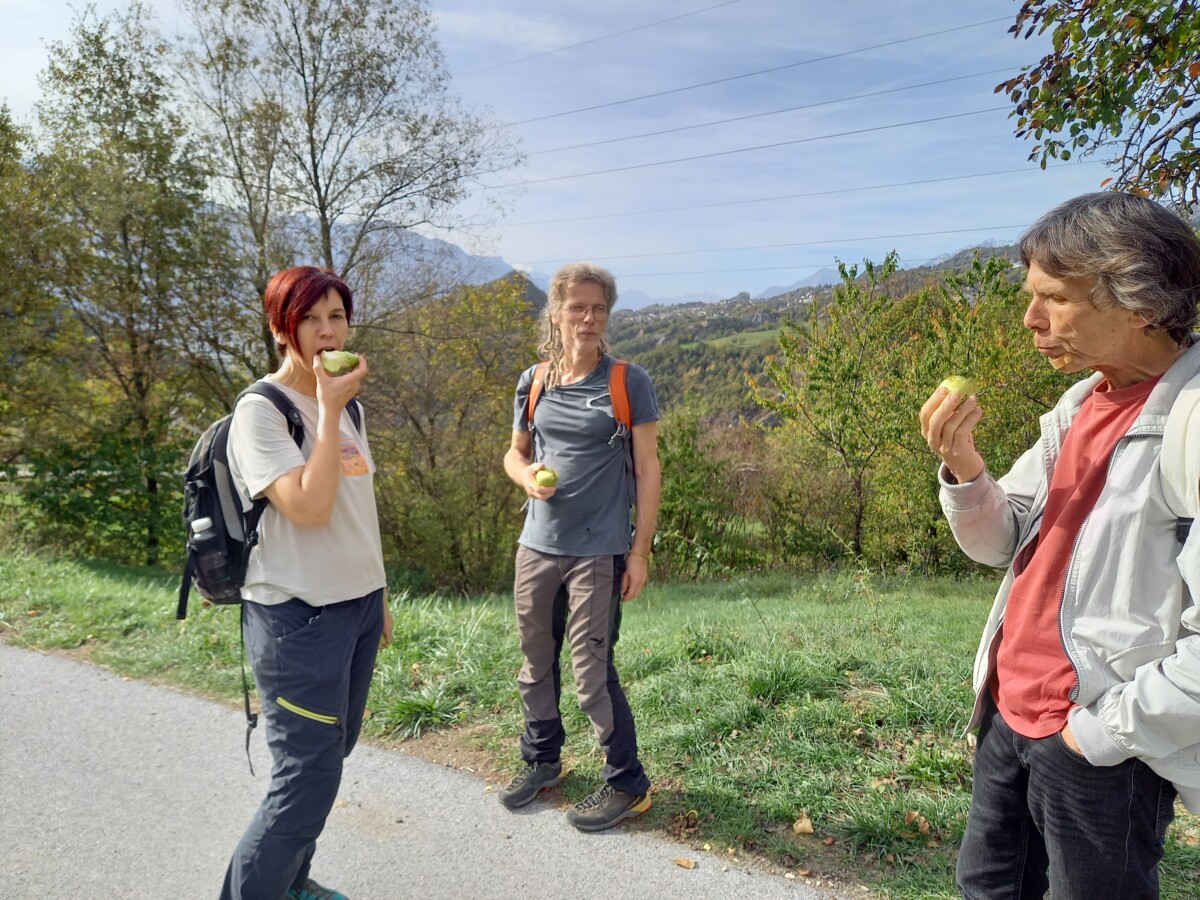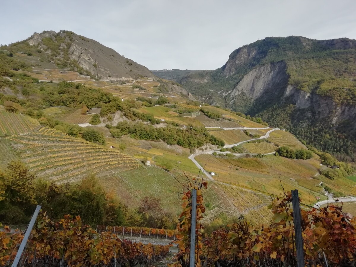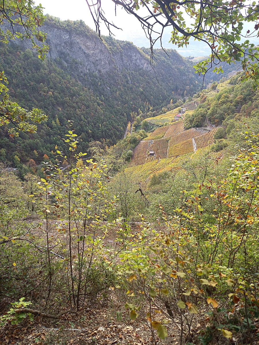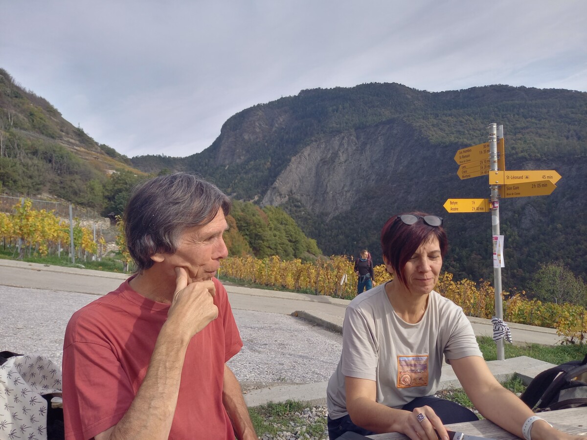 30 oktober: We beleefden tijdens ons bezoek niet alleen Kirsten’s verjaardag maar ook het afscheid van de zomertijd. Om 7 uur al uit bed (eigenlijk 8 uur dus), een uurtje gewonnen! Gauw een geïmproviseerd ontbijt, en dan 4 kleine rugzakjes vol brood, kaas, beleg, (droog) fruit en groenteschijfjes en uiteraard water pakken voor we een uurtje later per auto naar het station Allaman (bij Morges) rijden. Vandaar per trein naar het befaamde Wallis, uitstappen in Sion en vandaar met een postbus (zo heette ‘ie) naar Icogne, een leuk bergdorpje met veel houten huizen, en dan maar wandelen… Eerst de verkeerde kant op, maar dan uiteindelijk met heerlijk mooi herfstweer wandelden we via de Bisse du Clavau en eindeloze, bewateringsdijkjes door hooggelegen wijnbergen met een uitzicht op magnifieke bergpanorama’s met zelfs al witte toppen van de eerste sneeuw deze herfst! Het begin van de wandeling was zelfs voor laaglanders gezellig en rustig tot we een diep dal (1100 hoogteverschil, de Icogne) bereikten.