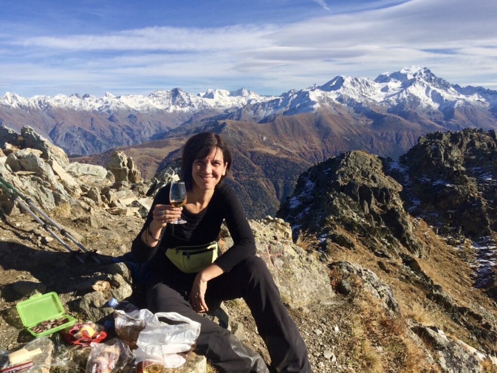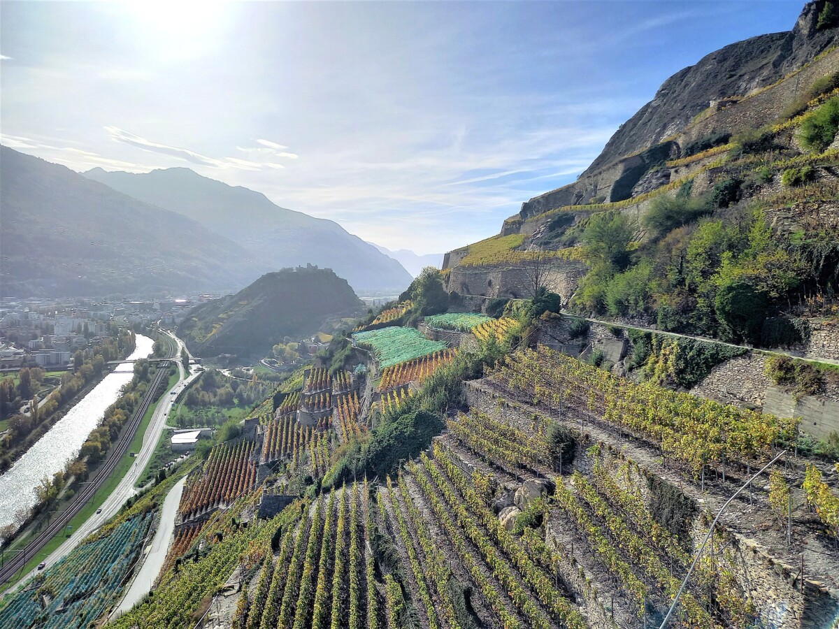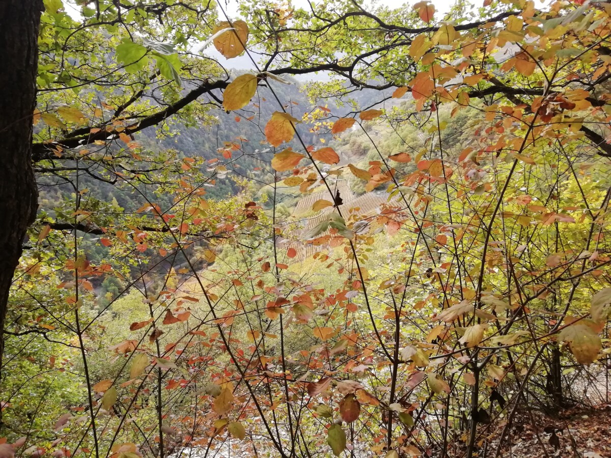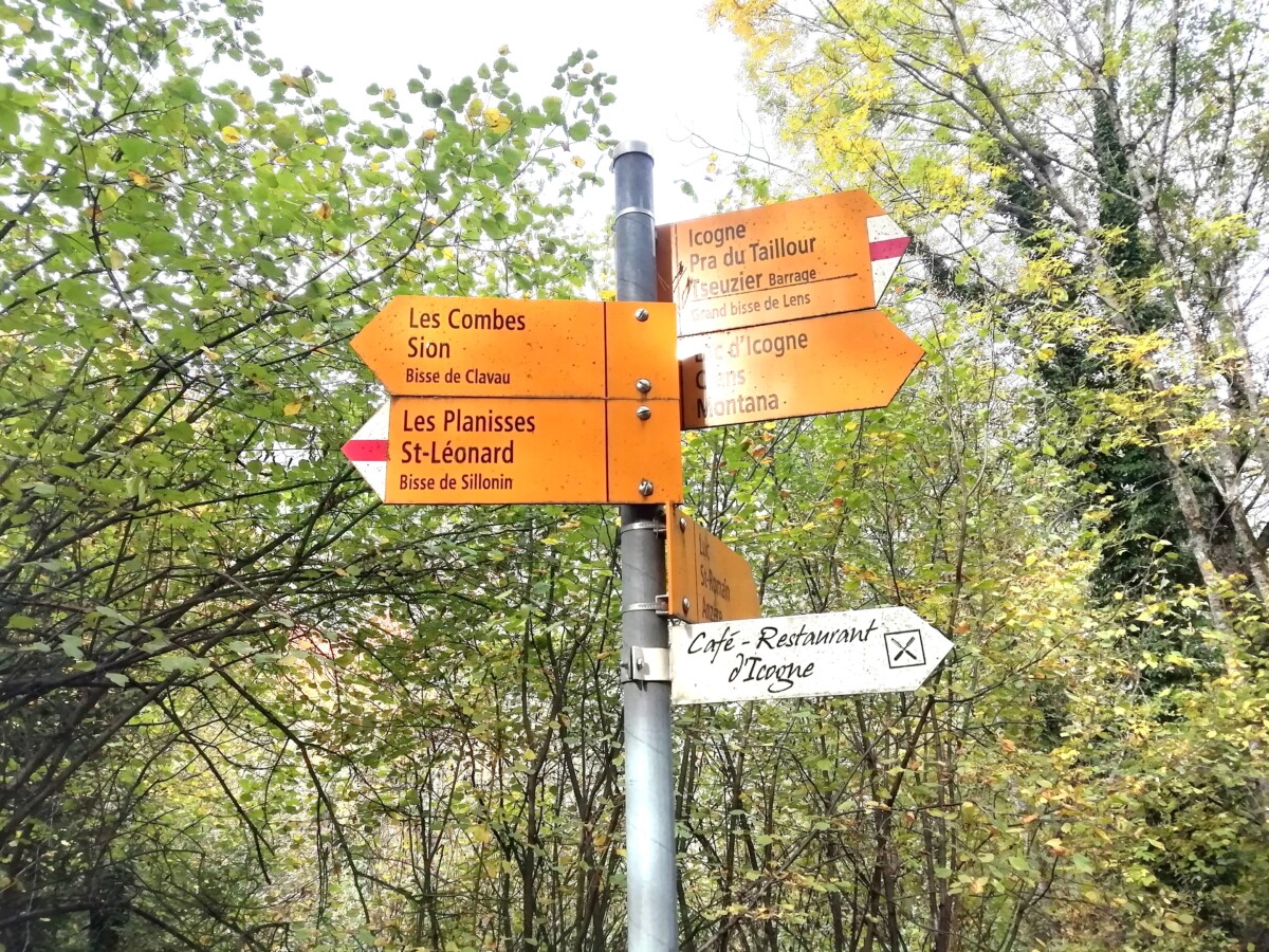 30 oktober: We beleefden tijdens ons bezoek niet alleen Kirsten’s verjaardag maar ook het afscheid van de zomertijd. Om 7 uur al uit bed (eigenlijk 8 uur dus), een uurtje gewonnen! Gauw een geïmproviseerd ontbijt, en dan 4 kleine rugzakjes vol brood, kaas, beleg, (droog) fruit en groenteschijfjes en uiteraard water pakken voor we een uurtje later per auto naar het station Allaman (bij Morges) rijden. Vandaar per trein naar het befaamde Wallis, uitstappen in Sion en vandaar met een postbus (zo heette ‘ie) naar Icogne, een leuk bergdorpje met veel houten huizen, en dan maar wandelen… Eerst de verkeerde kant op, maar dan uiteindelijk met heerlijk mooi herfstweer wandelden we via de Bisse du Clavau en eindeloze, bewateringsdijkjes door hooggelegen wijnbergen met een uitzicht op magnifieke bergpanorama’s met zelfs al witte toppen van de eerste sneeuw deze herfst! Het begin van de wandeling was zelfs voor laaglanders gezellig en rustig tot we een diep dal (1100 hoogteverschil, de Icogne) bereikten.
