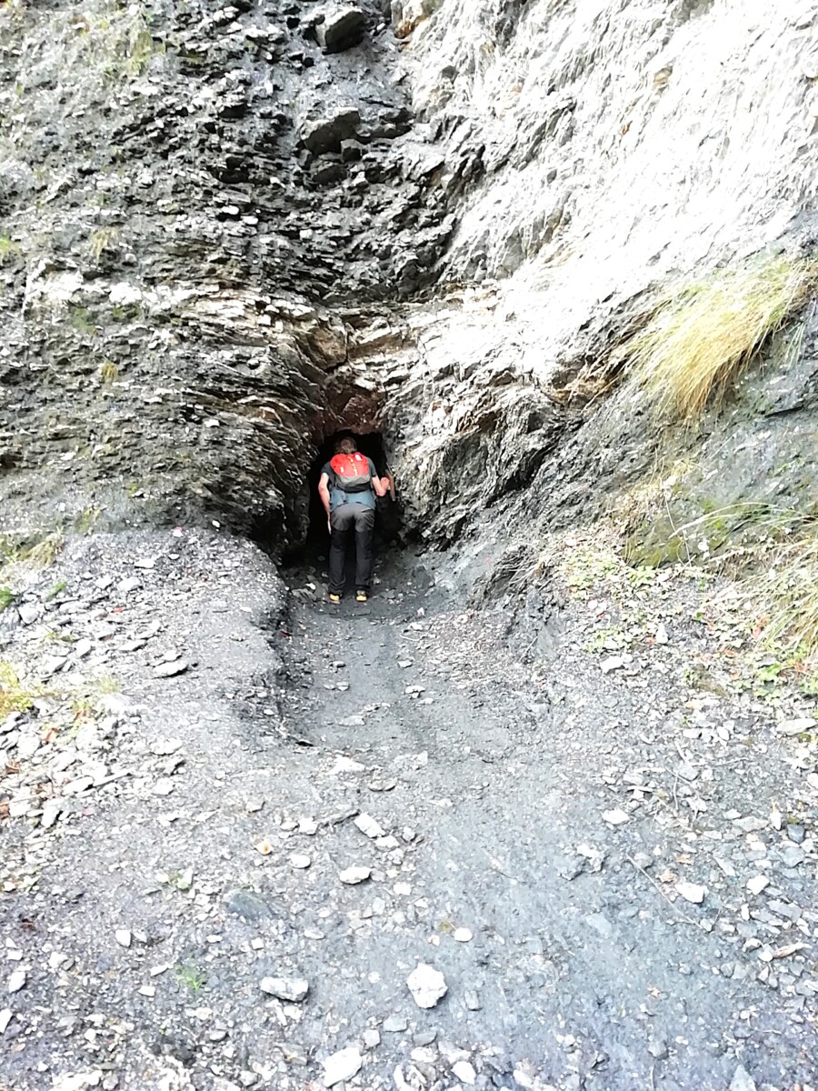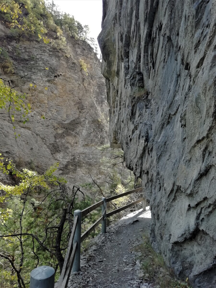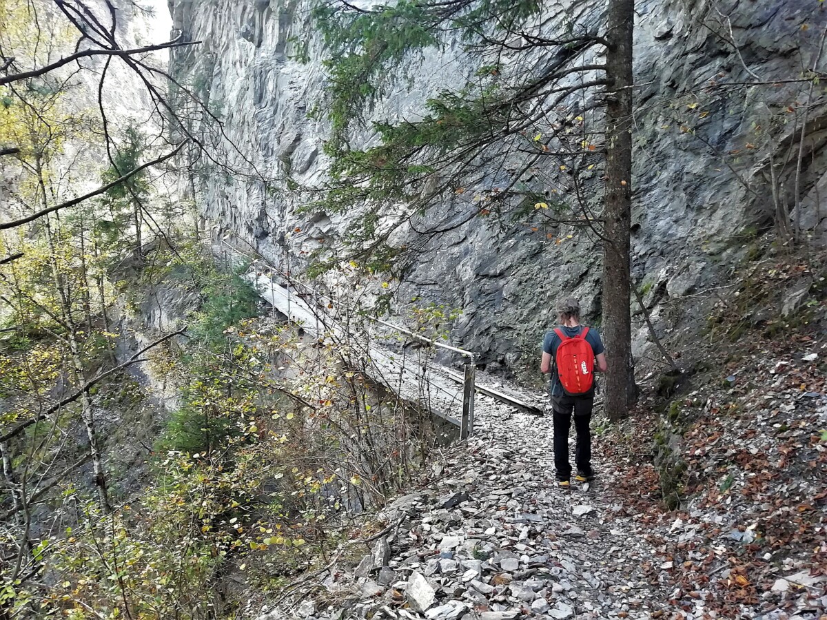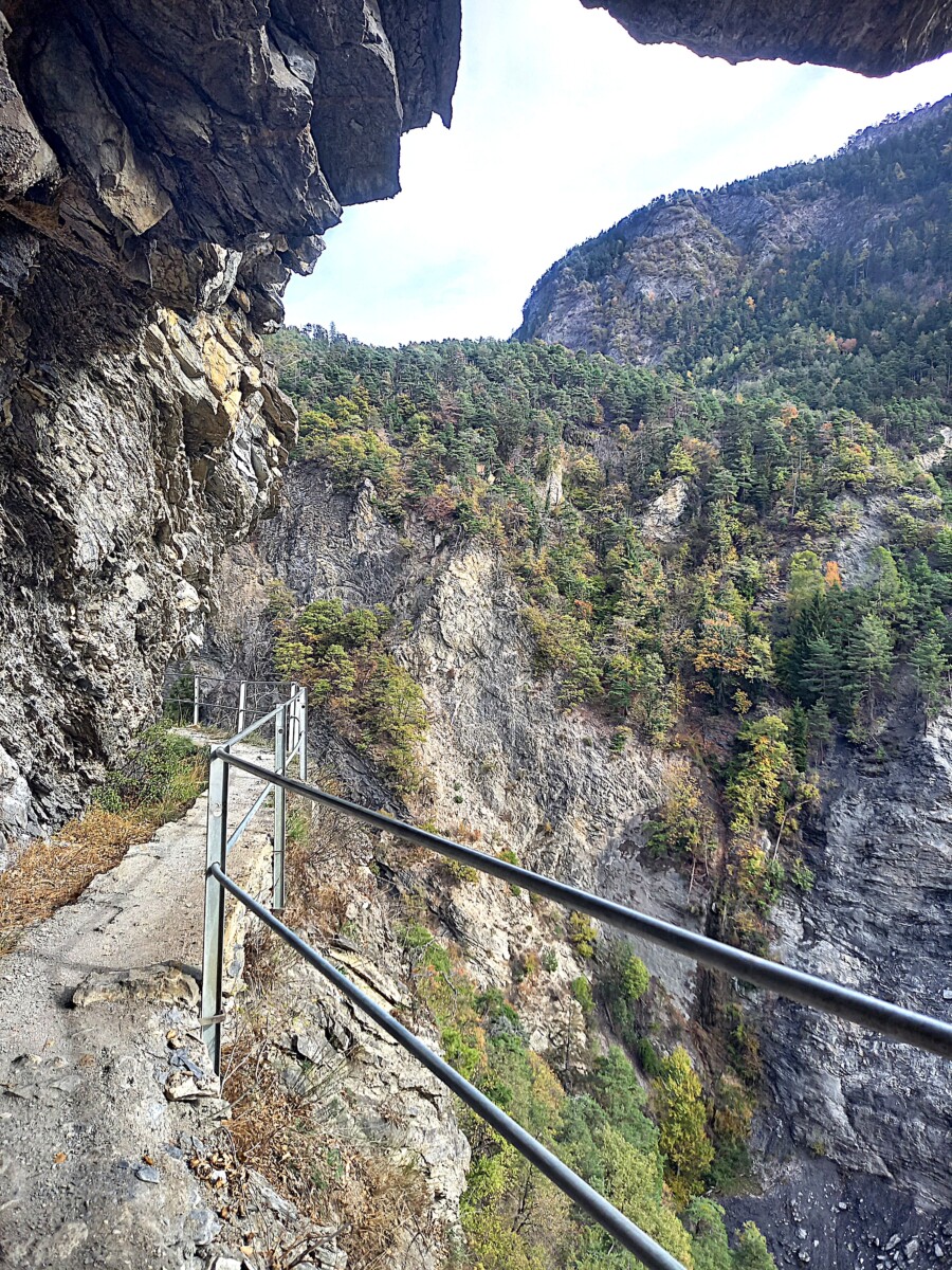 Het pad werd glibberig, wel nog min of meer waterpas, spannend gelegen langs bergwanden, vaak bestaand uit houten planken en met metalen afrasteringen langs de afgronden. Ook nog door een lage looptunnel gewandeld, donker, wel verlicht dankzij een smartphone-processie. Uit de tunnel dan opeens een fantastisch uitzicht op bergreuzen van boven de 3000 m hoogte. Zelf bevonden we ons op 660 m hoogte: dus beneden de bergbeek en boven de Alpengiganten rondom.