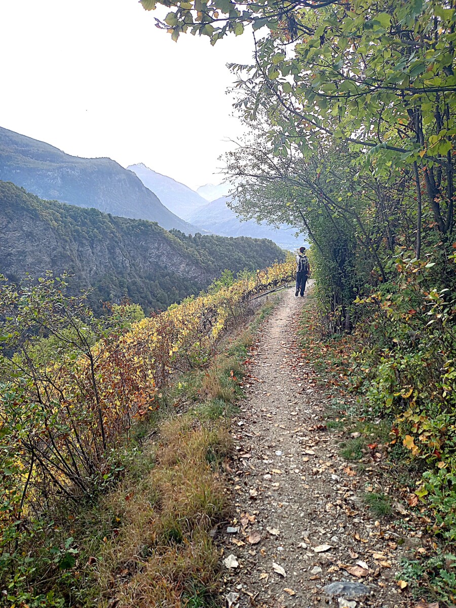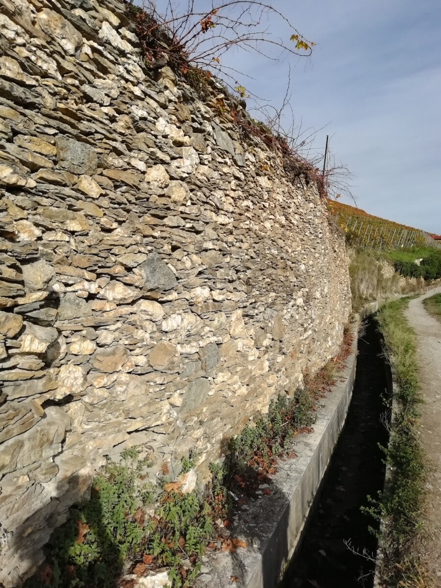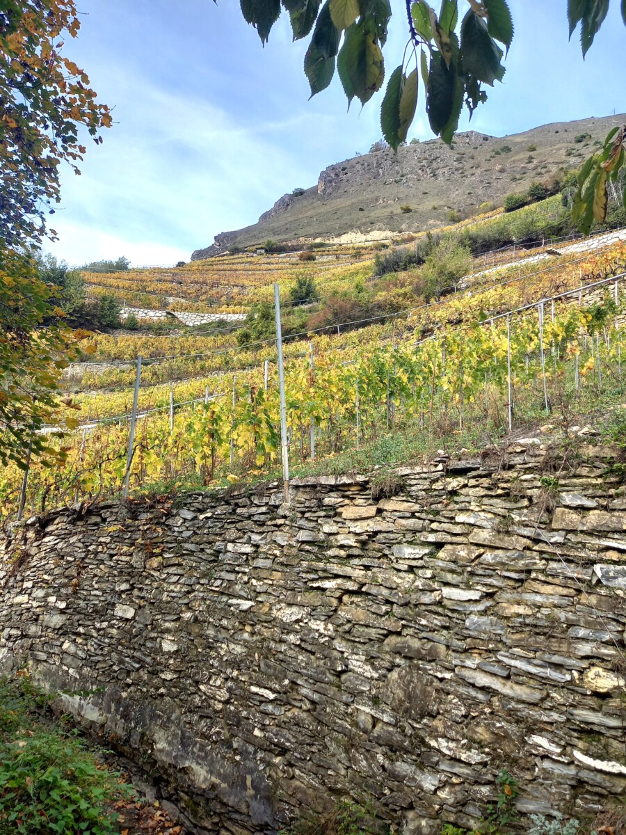 Spectaculair!!! Uiteindelijk wandelden we dan nog 6-7 km over dijkjes langs ‘bisses’ (watergeulen) in de wijnbergen. De uitzichten over de herfstige wijnbergen bleven prachtig. Mooi, mooi, mooi.