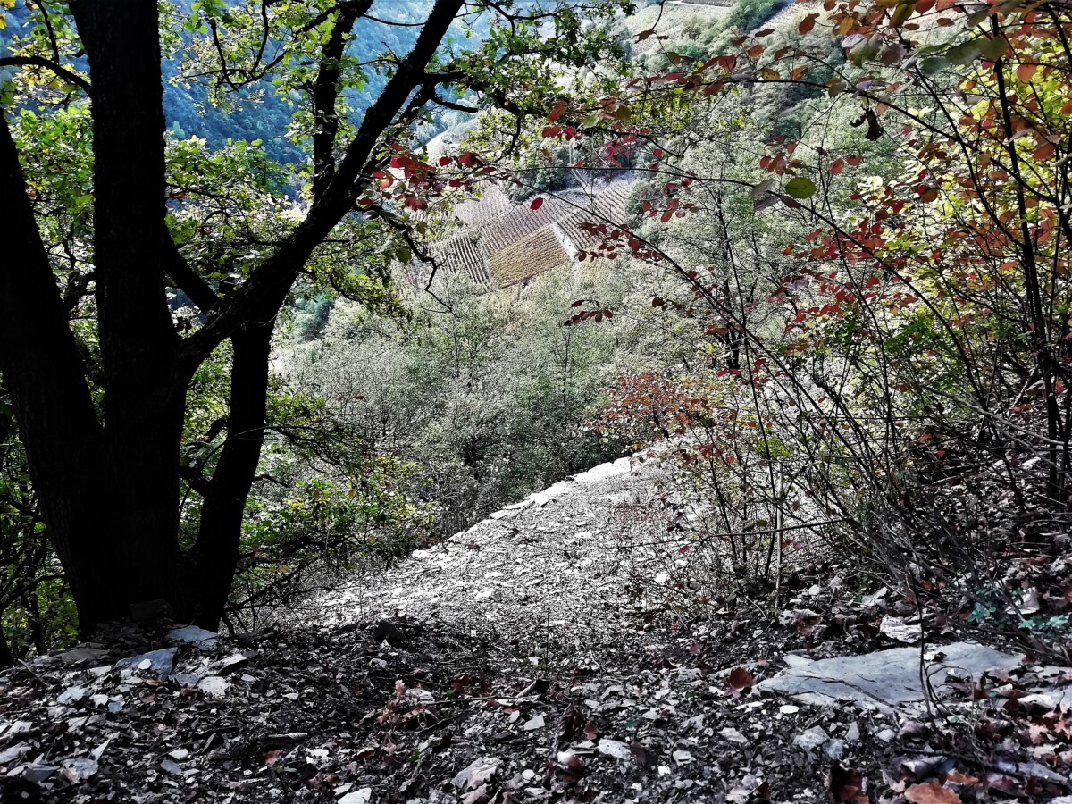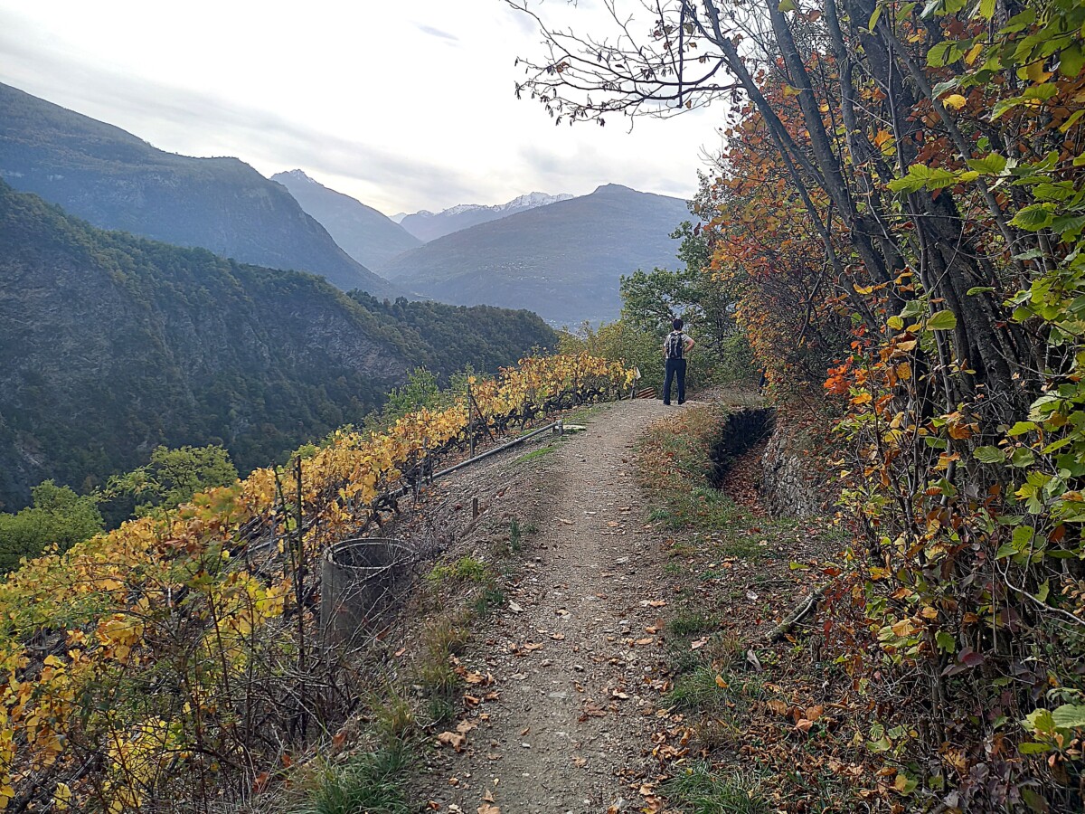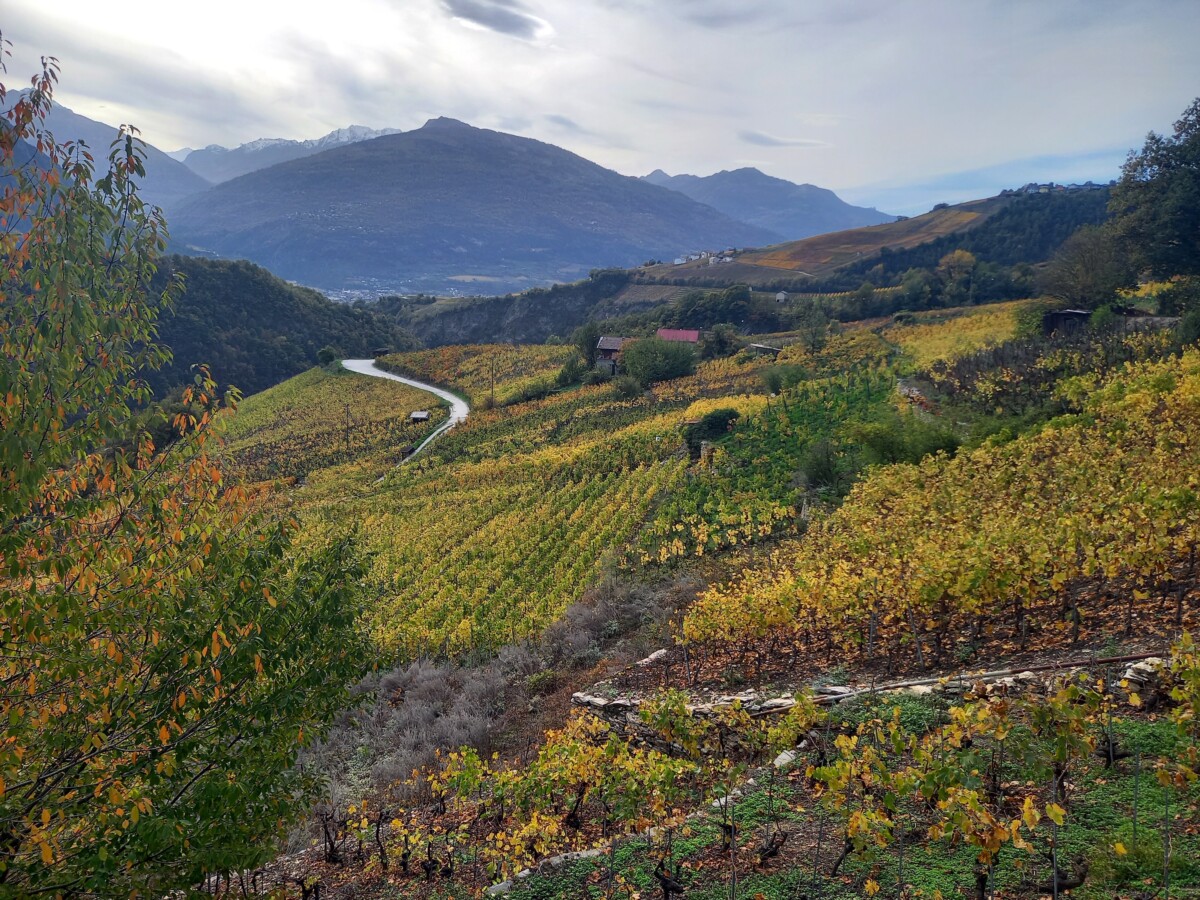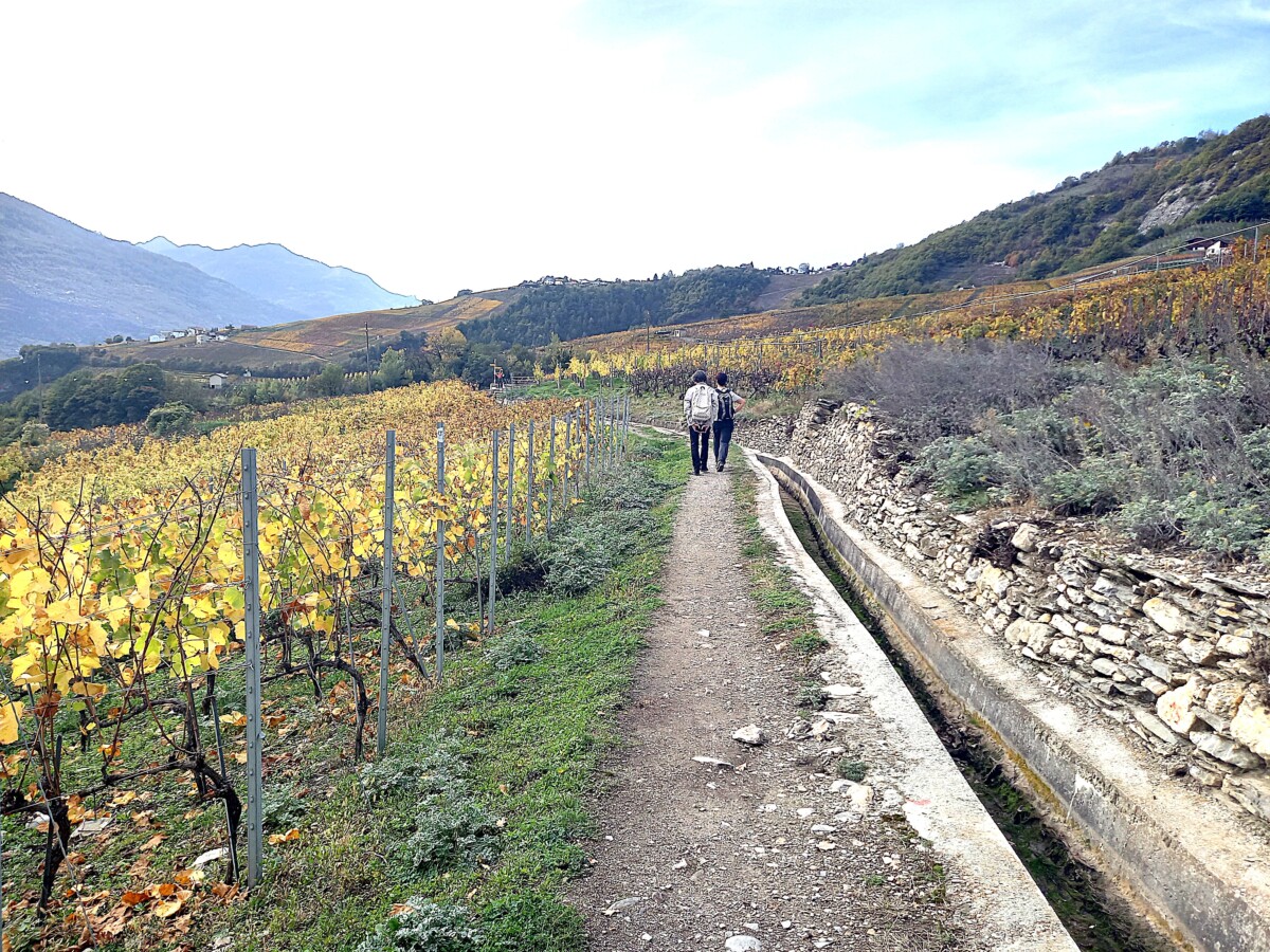 Spectaculair!!! Uiteindelijk wandelden we dan nog 6-7 km over dijkjes langs ‘bisses’ (watergeulen) in de wijnbergen. De uitzichten over de herfstige wijnbergen bleven prachtig. Mooi, mooi, mooi.