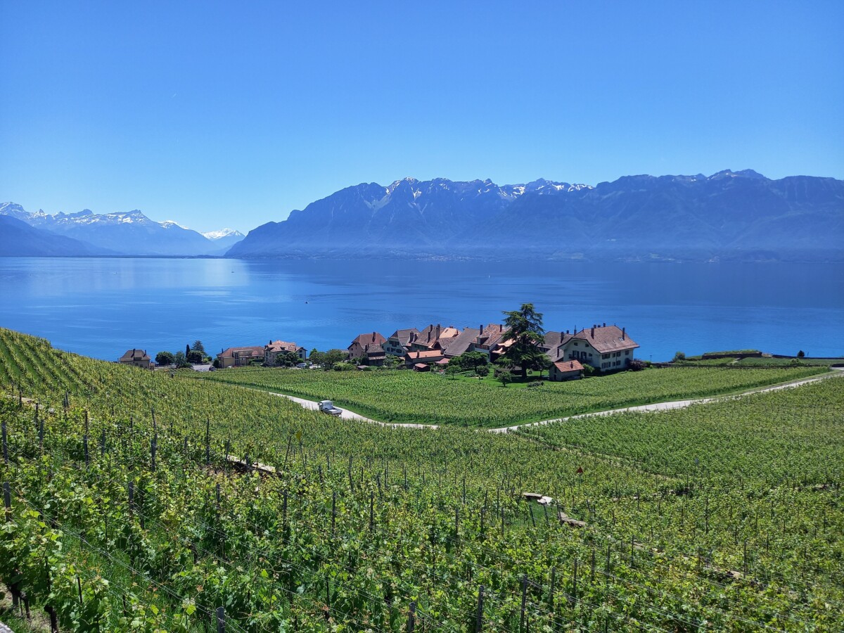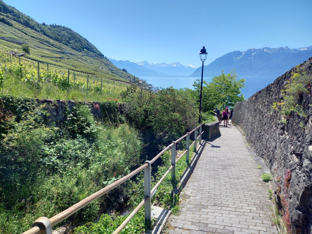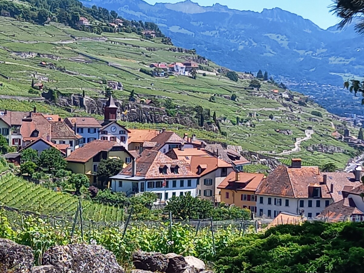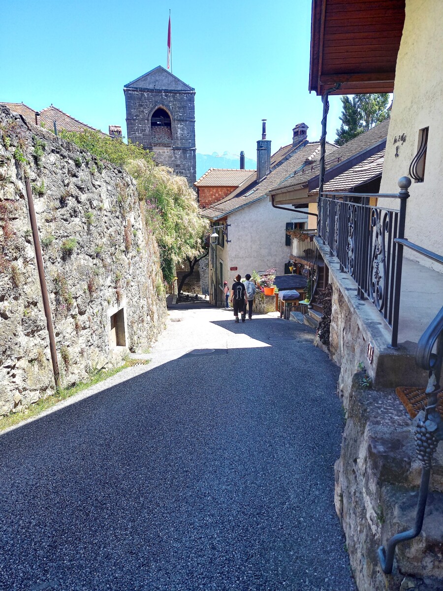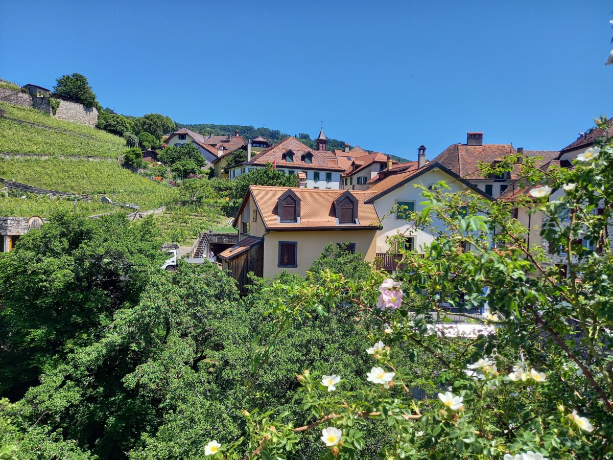 In Epesses keken we eerst een beetje rond voor we naar het buurdorp Rivaz wandelden. Soms zochten we even de schaduw van schaarse bomen op gezien de stekende zon rondom. We stelden vast, dat we lang niet meer zo’n felle zon gevoeld hadden. Toch besloten we – het was gewoon te mooi overal – nog een dorp verder te wandelen: Saint Saphorin. Kirsten kende het mooiste van de mooie dorpjes ook nog niet en dan bleek er ook nog een restaurantje met dakterras en zeezicht open! Wat gegeten en gedronken met heerlijk uitzicht op besneeuwde Alpentoppen, een prachtig glinsterend meer en nabije wijnbergen (UNESCO-werelderfgoed).
