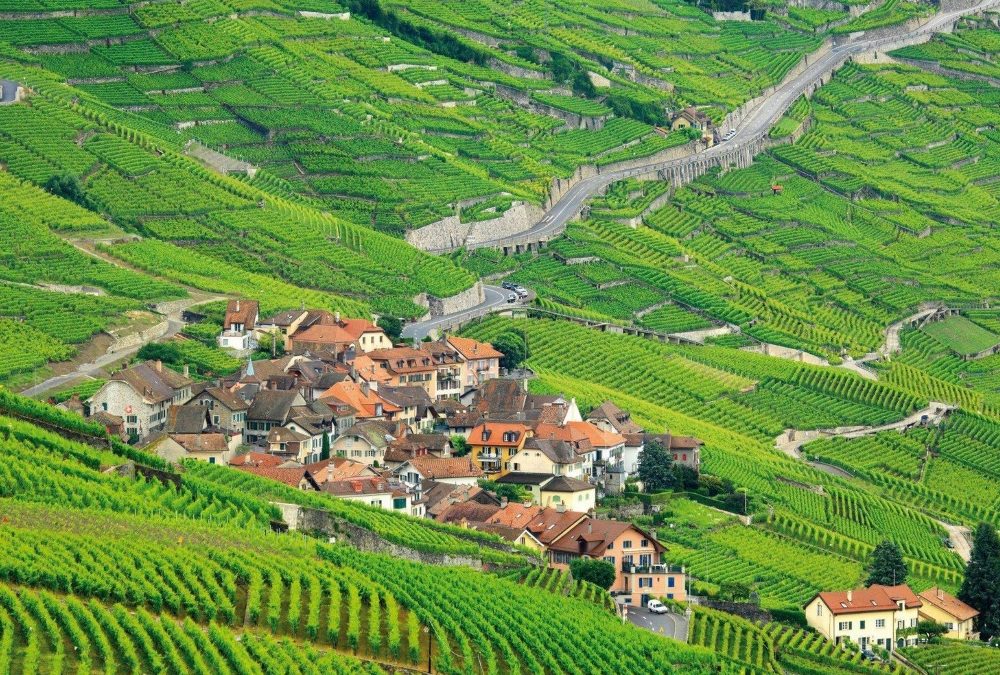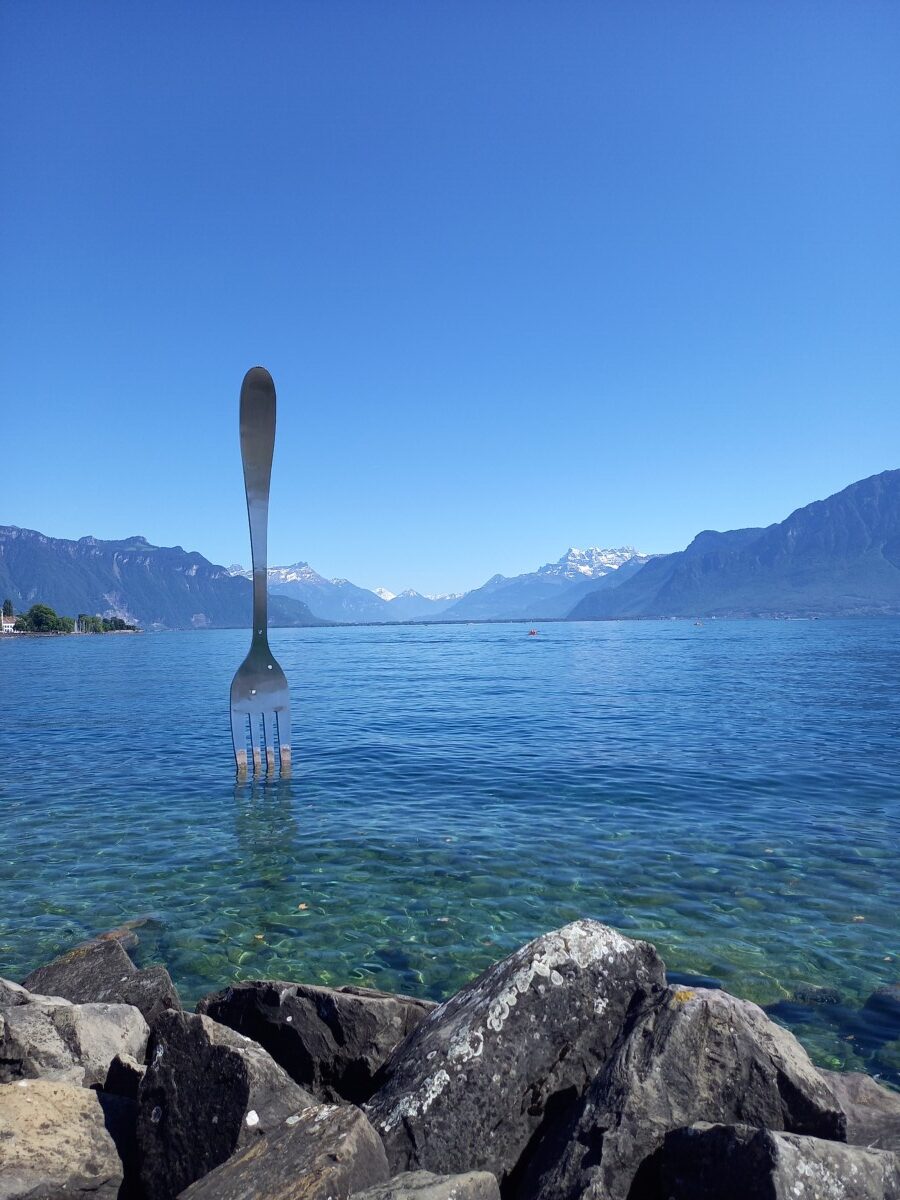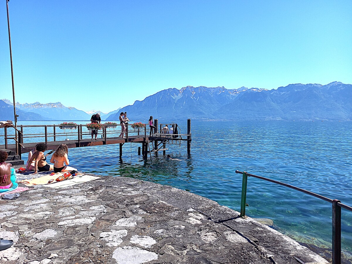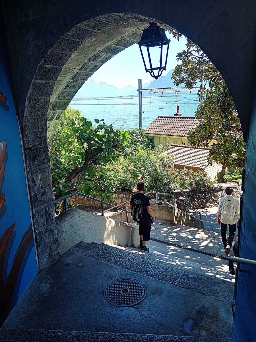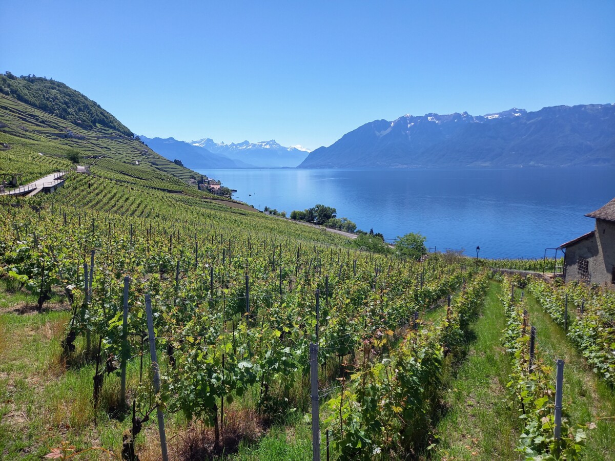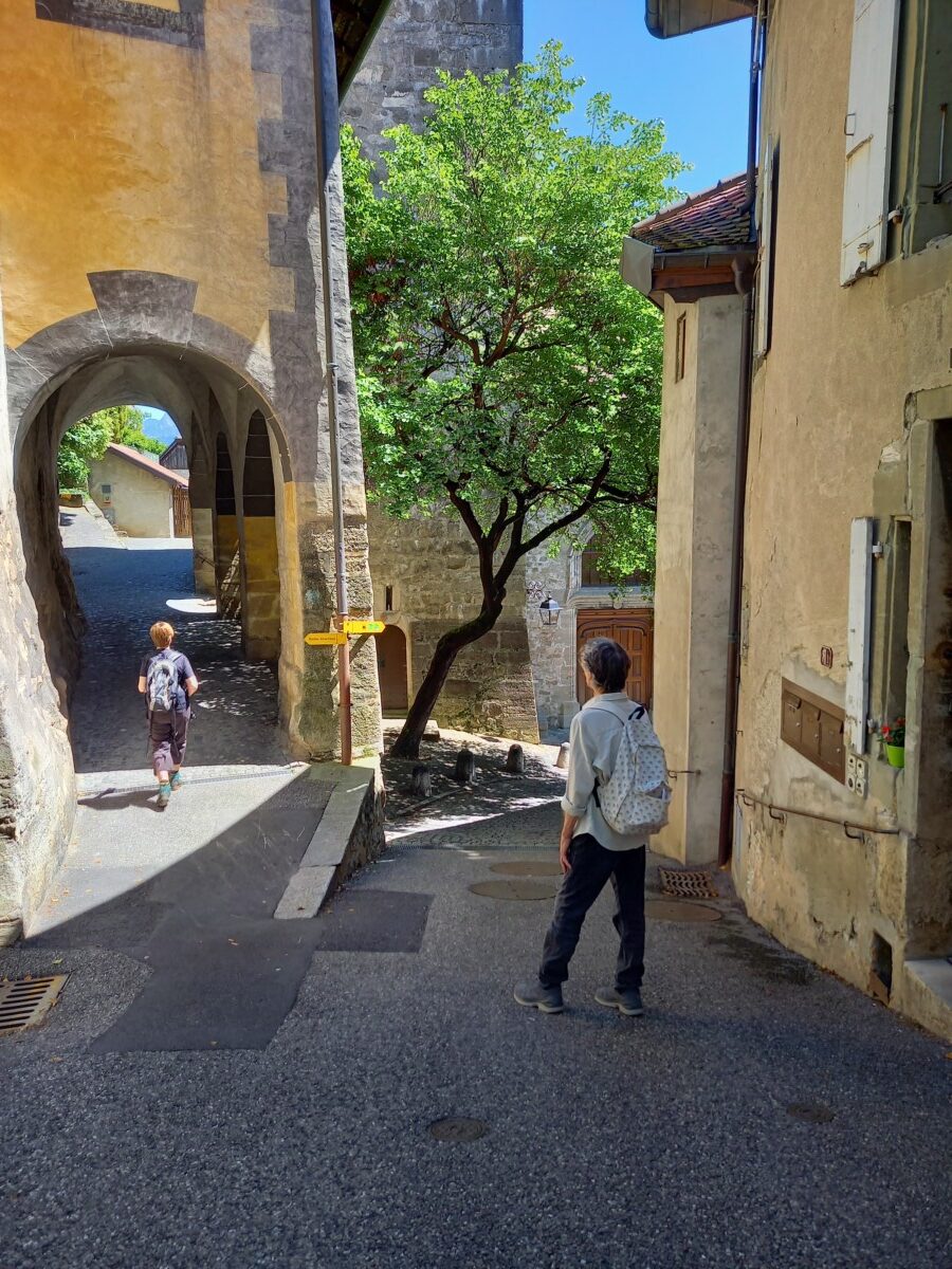 In Epesses keken we eerst een beetje rond voor we naar het buurdorp Rivaz wandelden. Soms zochten we even de schaduw van schaarse bomen op gezien de stekende zon rondom. We stelden vast, dat we lang niet meer zo’n felle zon gevoeld hadden. Toch besloten we – het was gewoon te mooi overal – nog een dorp verder te wandelen: Saint Saphorin. Kirsten kende het mooiste van de mooie dorpjes ook nog niet en dan bleek er ook nog een restaurantje met dakterras en zeezicht open! Wat gegeten en gedronken met heerlijk uitzicht op besneeuwde Alpentoppen, een prachtig glinsterend meer en nabije wijnbergen (UNESCO-werelderfgoed).