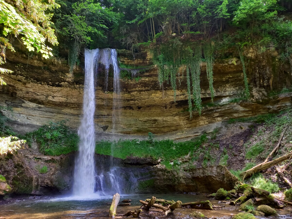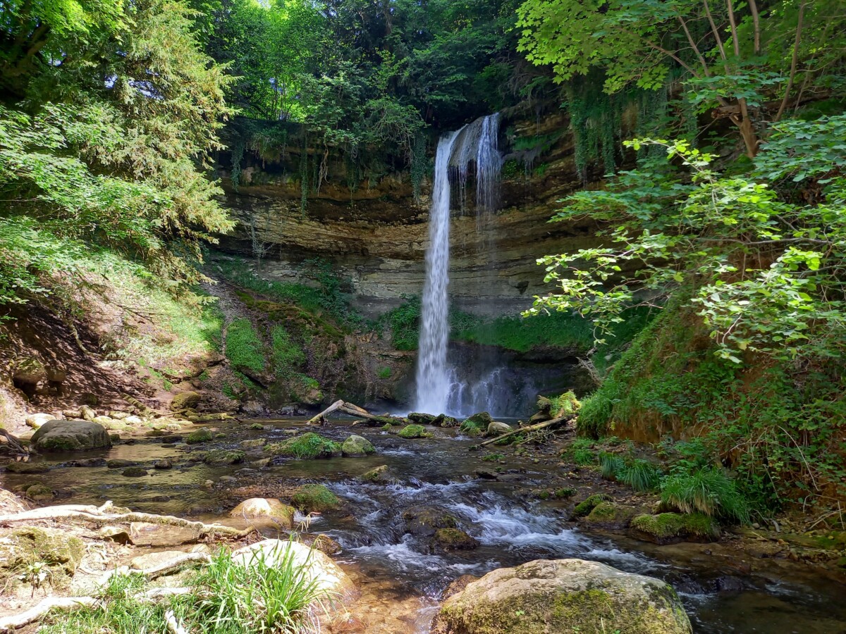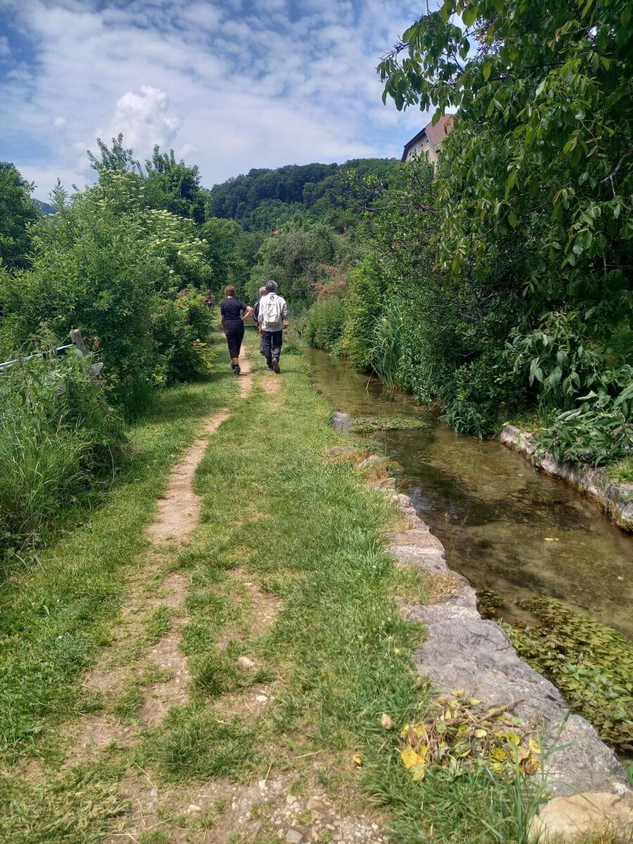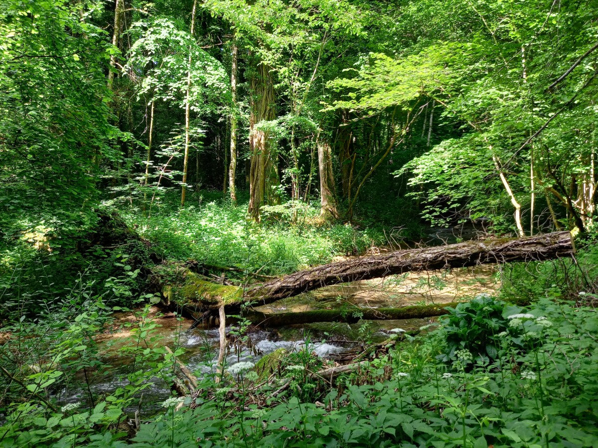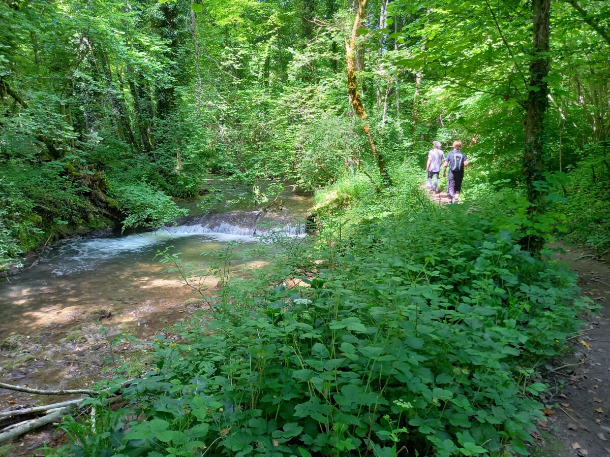 Zaterdag 31 mei: Gezellig ontbijt met z’n vieren, overgaand in de voorbereidingen van een mooie wandeling in de Jura. Daar parkeerden we ruim voor het middaguur en na een mooie panoramische autotoer op een parkeerterrein van een l’hôpital (ziekenhuis) bij Saint Loup. Hier bevindt zich de ingang van een heel oud, weelderig bos in een héél fris groen ravijn met de wilde bergrivier Nozon (Gorges du Nozon).