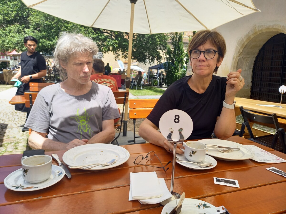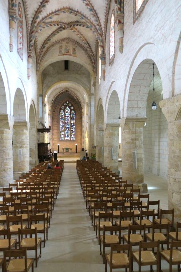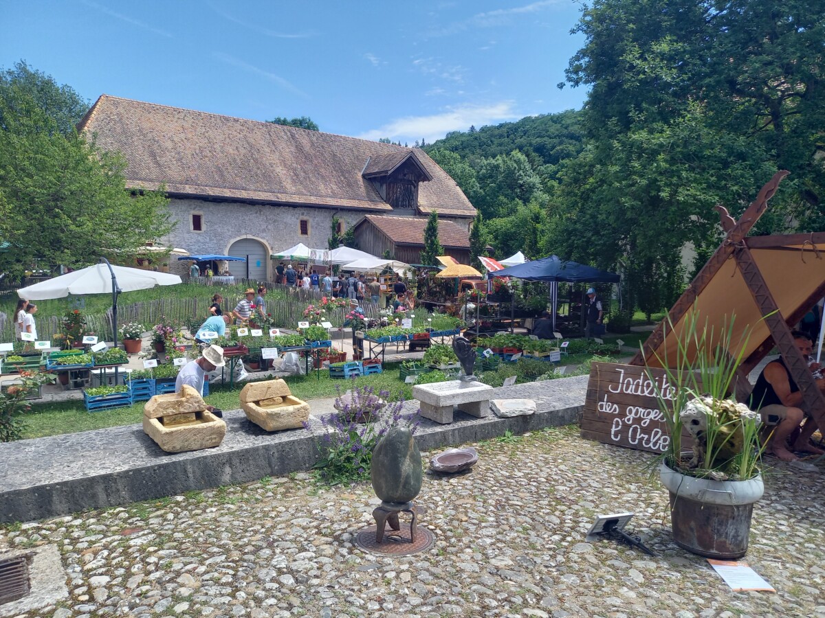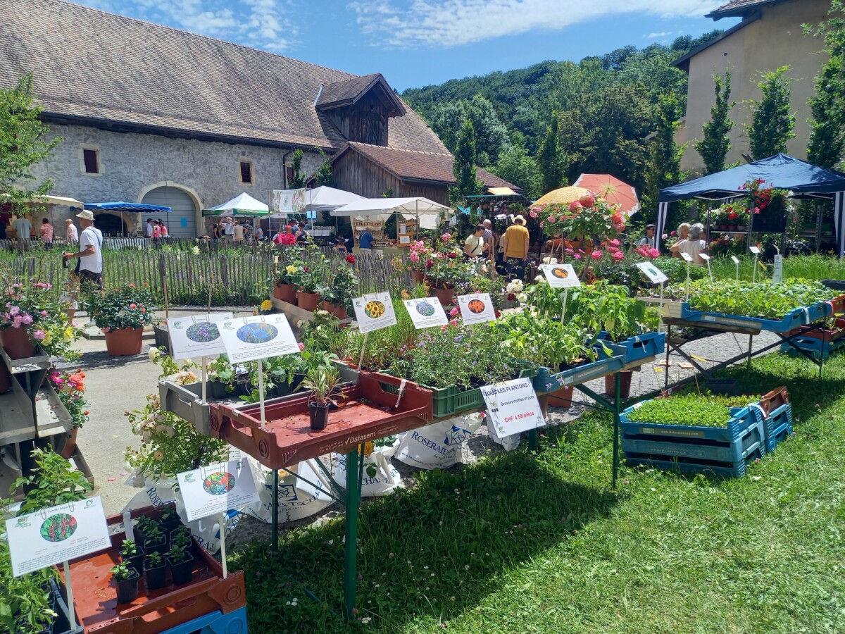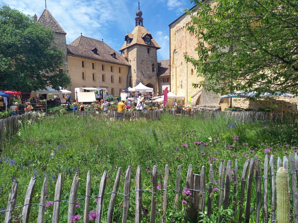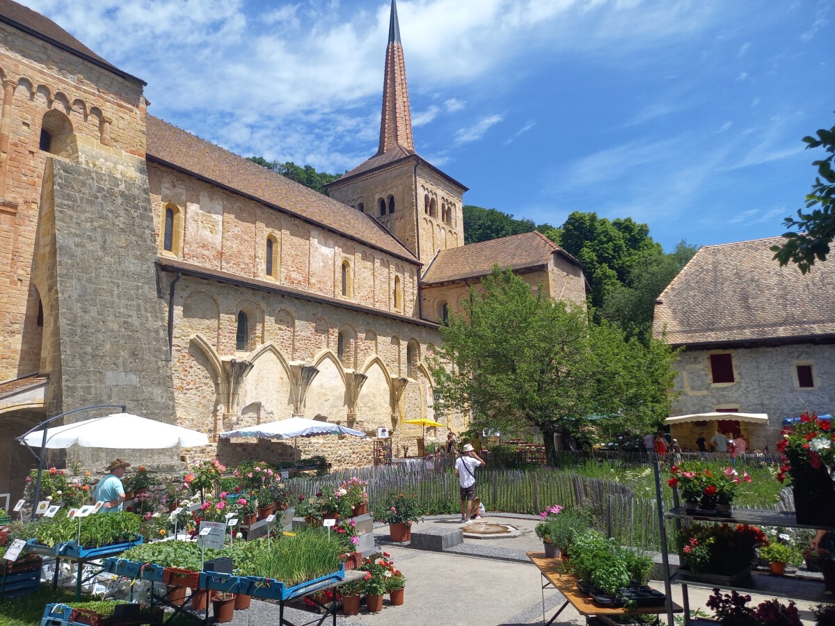 Uiteindelijk belandden we in Romainmôtier (zie ook boven, verhaal van pasen 2019 in St. Livres). Een dorpje met een pracht van een oud klooster, poort met ommuring, en een binnenhof waar toevallig een sfeervolle planten- en tuinmarkt plaatsvond. Op het terras genoten van koffie en gebakje en samen met Marianne ook nog even de abdijkerk van binnen bewonderd. Werkelijk indrukwekkend en een héél mooi cultureel intermezzo!