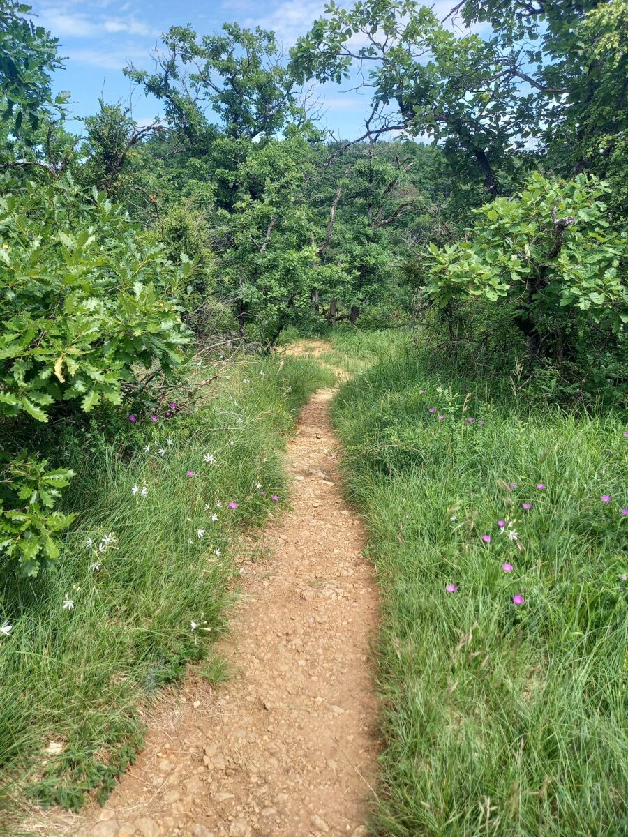 Langs de andere kant van het ravijn weer teruggelopen naar Saint Loup. Weer helemaal onder de indruk van de heerlijke voorjaarsflora, deze keer nog aangevuld met een kalkrijk rotsig stuk met enkele orchideeënsoorten – mannetjesorchis, poppen- en groenknolorchis – en als topper uiteindelijk ook nog Welriekende nachtorchis (!). Voor de vele onbekende rotsplantjes hadden we een plantenvinder (app) moeten raadplegen (maar dat wilden we onze gastgevers niet aandoen…).