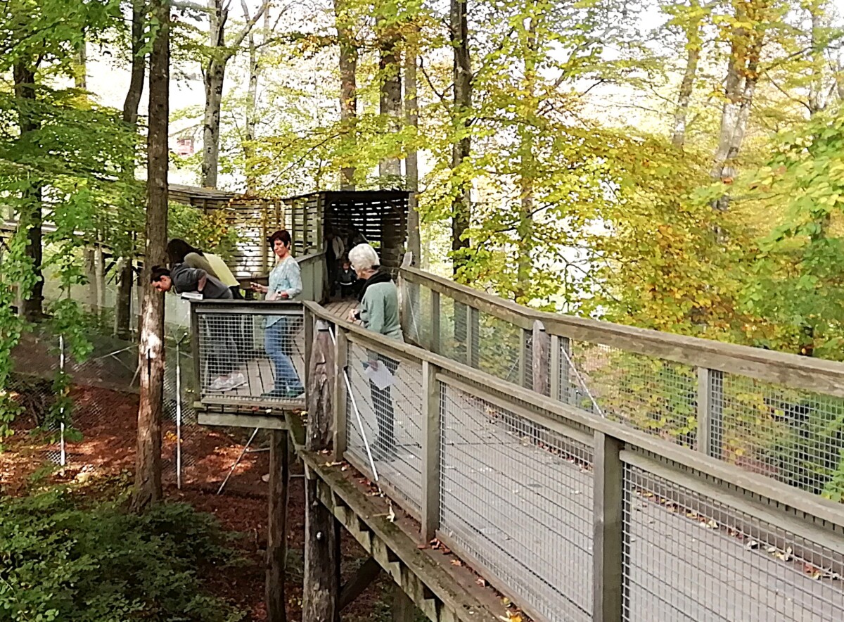 en vervolgens tussen 12.30 – 16 uur met z’n zessen in de familiekoets naar een alternatieve dierentuin in La Garenne met uitsluitend inheemse, zeldzame diersoorten en huisdierrassen. Een combinatie van dierenopvang van gewonde dieren en fokprogramma van bedreigde diersoorten, zoals lynx, wolf, das, bever, uilen en andere roofvogels, met als hoogtepunt op enkele meters afstand, in een reuzevolière, twee lammergieren. Erg indrukwekkend! Mooie volières en ruime uitloopgebieden in natuurlijk bos met spannende paden en bruggen.