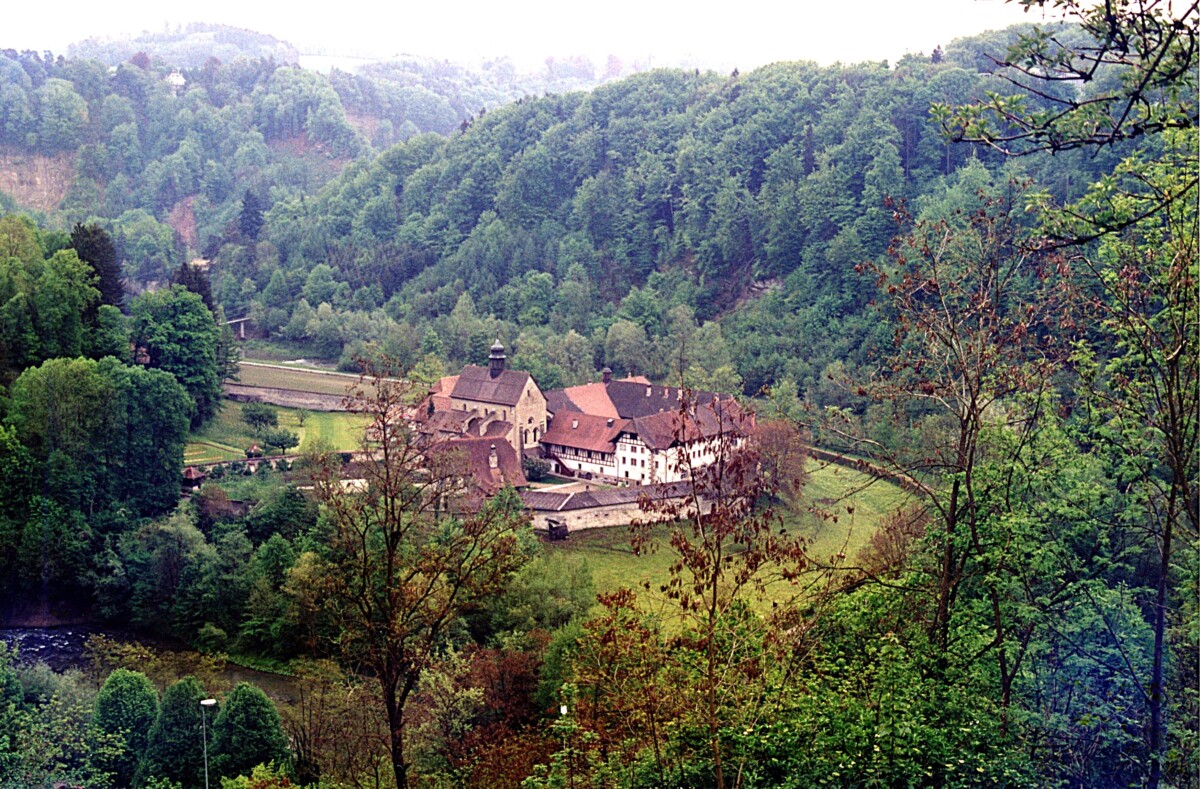 2e Paasdag: Tussen 9 en 10 uur druppelde iedereen binnen voor zijn ontbijt waar we ons allen de tijd voor namen. Ergens tegen de middag gingen we weer met Kirsten op stap, de Hoge Jura in. Doel was een heerlijk klein dorpje met een indrukwekkend oud en fraai kloostercomplex: Romainmôtier. Daar lieten we ons ruim de tijd om het prachtige dorpje en de abdij te bezichtigen en wandelden uiteindelijk langs de Nozon, een onstuimige bergbeek, door fraaie bossen terug naar het dorp.