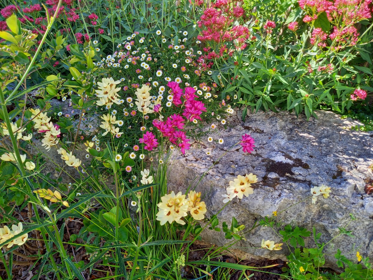 Langs de andere kant van het ravijn weer teruggelopen naar Saint Loup. Weer helemaal onder de indruk van de heerlijke voorjaarsflora, deze keer nog aangevuld met een kalkrijk rotsig stuk met enkele orchideeënsoorten – mannetjesorchis, poppen- en groenknolorchis – en als topper uiteindelijk ook nog Welriekende nachtorchis (!). Voor de vele onbekende rotsplantjes hadden we een plantenvinder (app) moeten raadplegen (maar dat wilden we onze gastgevers niet aandoen…).