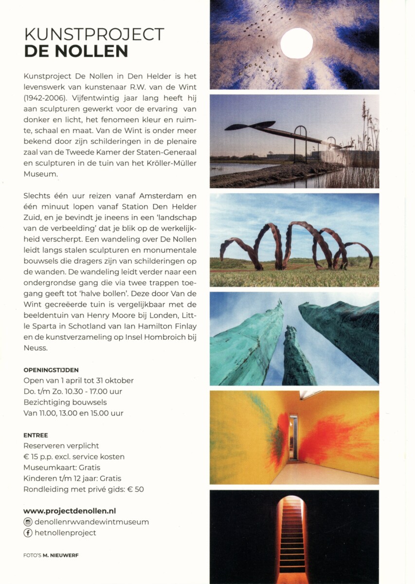 Dat deden we dan ook nog in hetzelfde jaar (10.11.2006). We benaderden het ruige duingebied niet via de hoofdingang maar via een spannend achteraf ingangetje. Een geïrriteerde dame wees ons daar ook op, maar bond gauw in toen we berouwvol duidelijk maakten dat we op zo´n manier niet gratis het terrein wilden verkennen, maar het echt puur toeval was dat we die ingang hadden ontdekt. Uiteindelijk kwamen we zelfs echt in gesprek en het lukte ons Jacqueline van Koningsbruggen er van te overtuigen dat een artikel in ons tijdschrift Oase voor beide partijen van waarde zou kunnen zijn. Al in het lentenummer 2007 publiceerden wij het artikel “Het Nollenproject – levenswerk van R.W. van de Wint”. Sinds die tijd bezochten we regelmatig dit prachtige voorbeeld van een geslaagde combinatie van beeldende kunst en natuur. 18 juni 2010 bijvoorbeeld i.s.m. Jan van Schaik, de wilgenman uit Amsterdam. Naast de Nollen stond een natuurspeelplek bij het kinderdagverblijf De Duinstruiners in Julianadorp en de Michaëlshof in Vatrop (Wieringen) op het programma.