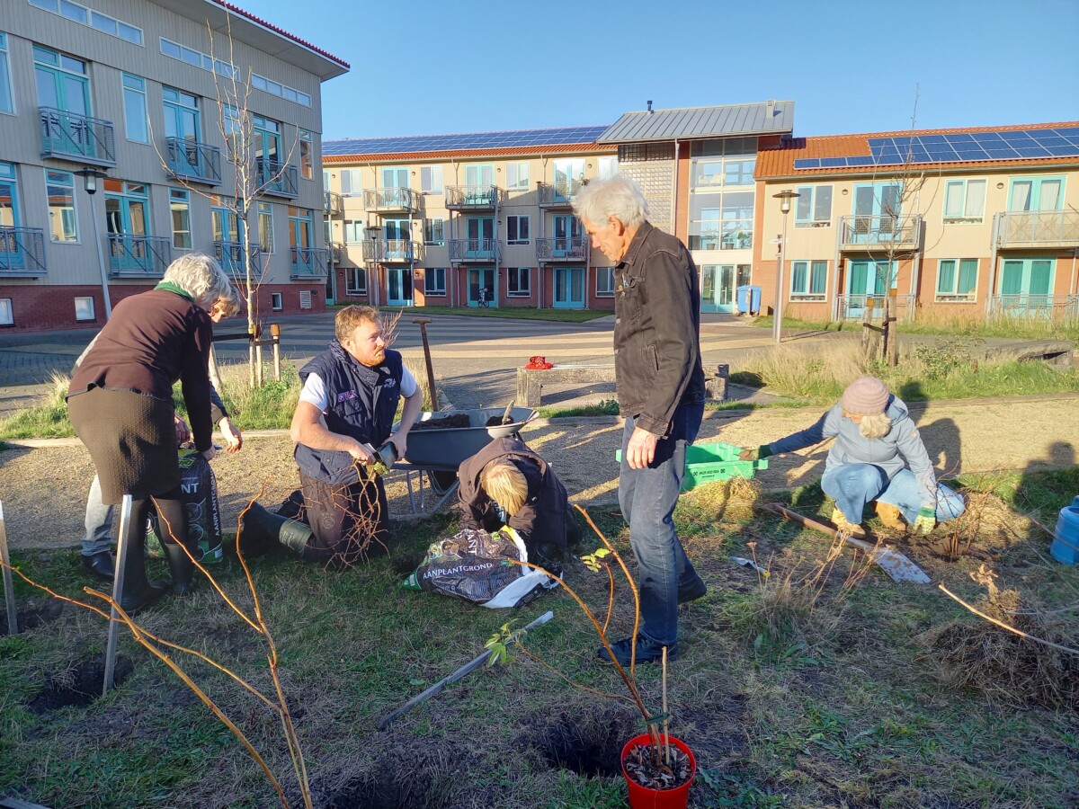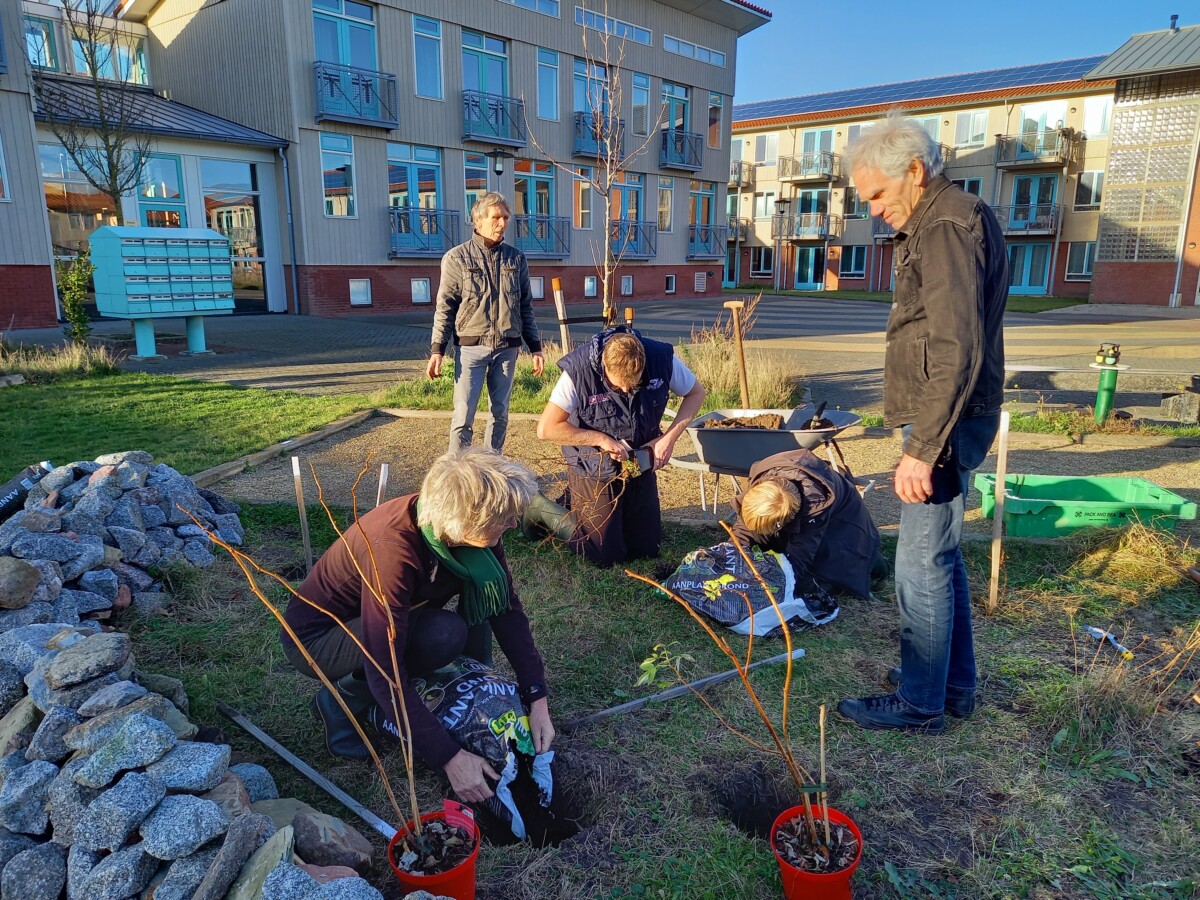 Op deze dag kwam Rob van der Steen ons plantwerk begeleiden. Hij legde goed uit hoe we de bomen en struiken het beste konden planten. Er kwamen spontaan ook andere bewoners van ’t Horntje meewerken!