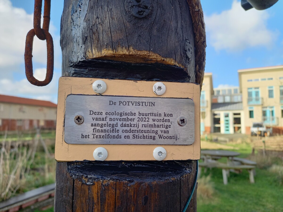 Geïnspireerd door alles wat we tijdens de excursie hadden gezien, gingen we hierna al snel weer verder aan de slag. Toen we terugkwamen van een korte vakantie stond er al een zelf gevlochten wilgenschutting, waardoor de afvalcontainers – gezien vanaf de picknickbank – uit zicht kwamen te staan. We kochten, met het geld van het Texelfonds het nodige gereedschap en Peter Kieft maakte een handig opbergsysteem in een van de fietsenbergingen. Hij was het ook die samen met ons bij bewoners van Den Hoorn, Den Burg en ’t Horntje materiaal (stenen, trottoirbanden, hout etc.) op ging halen voor de muurtjes en de kinderspeelplek. Zij wilden dit kwijt en wij waren er blij mee. Winwin dus!